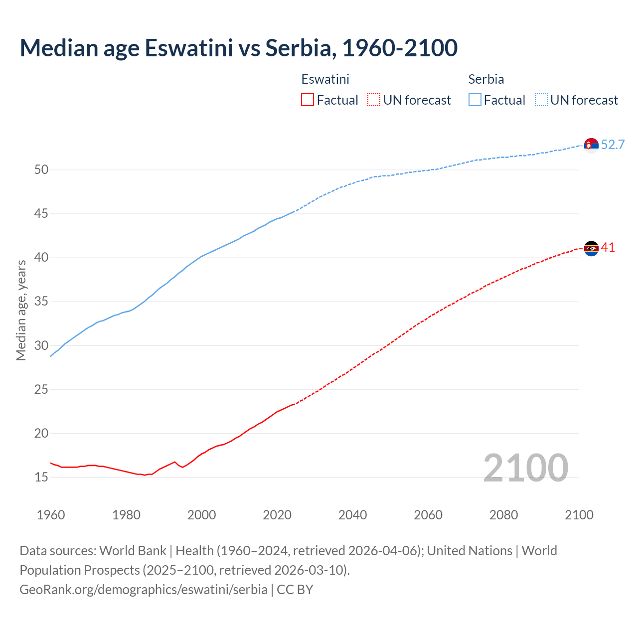 - Eswatini is ranked 141/196 by median age (oldest to youngest) vs 15/196 for Serbia.