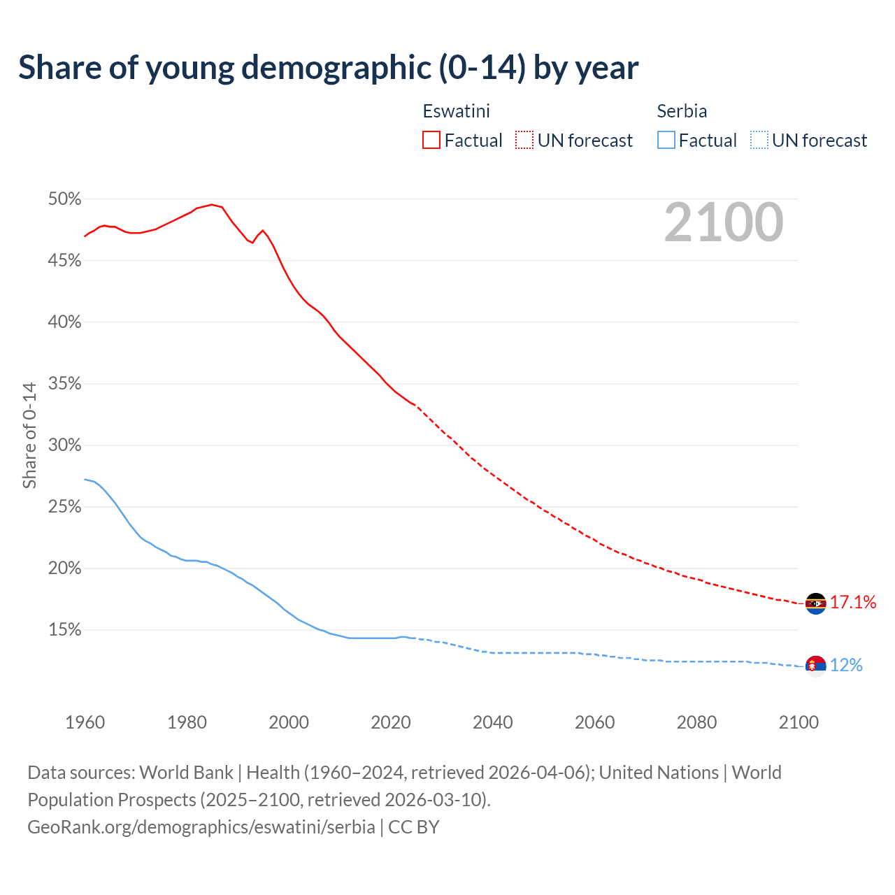 - The share of young demographic (0-15 years old) in Eswatini is 33.4% vs 14.3% in Serbia.