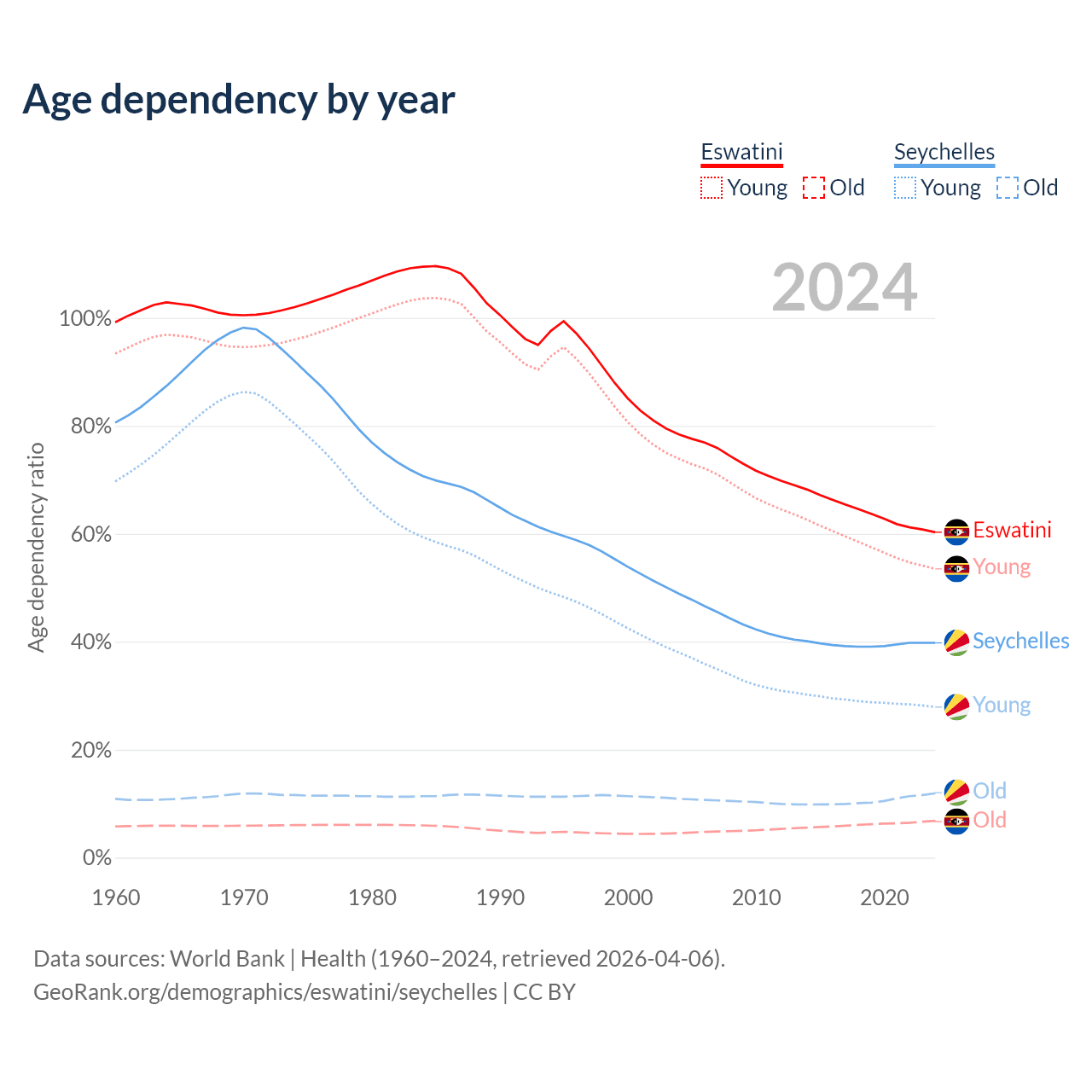 - Eswatini is ranked 141/196 by median age (oldest to youngest) vs 76/196 for the Seychelles.