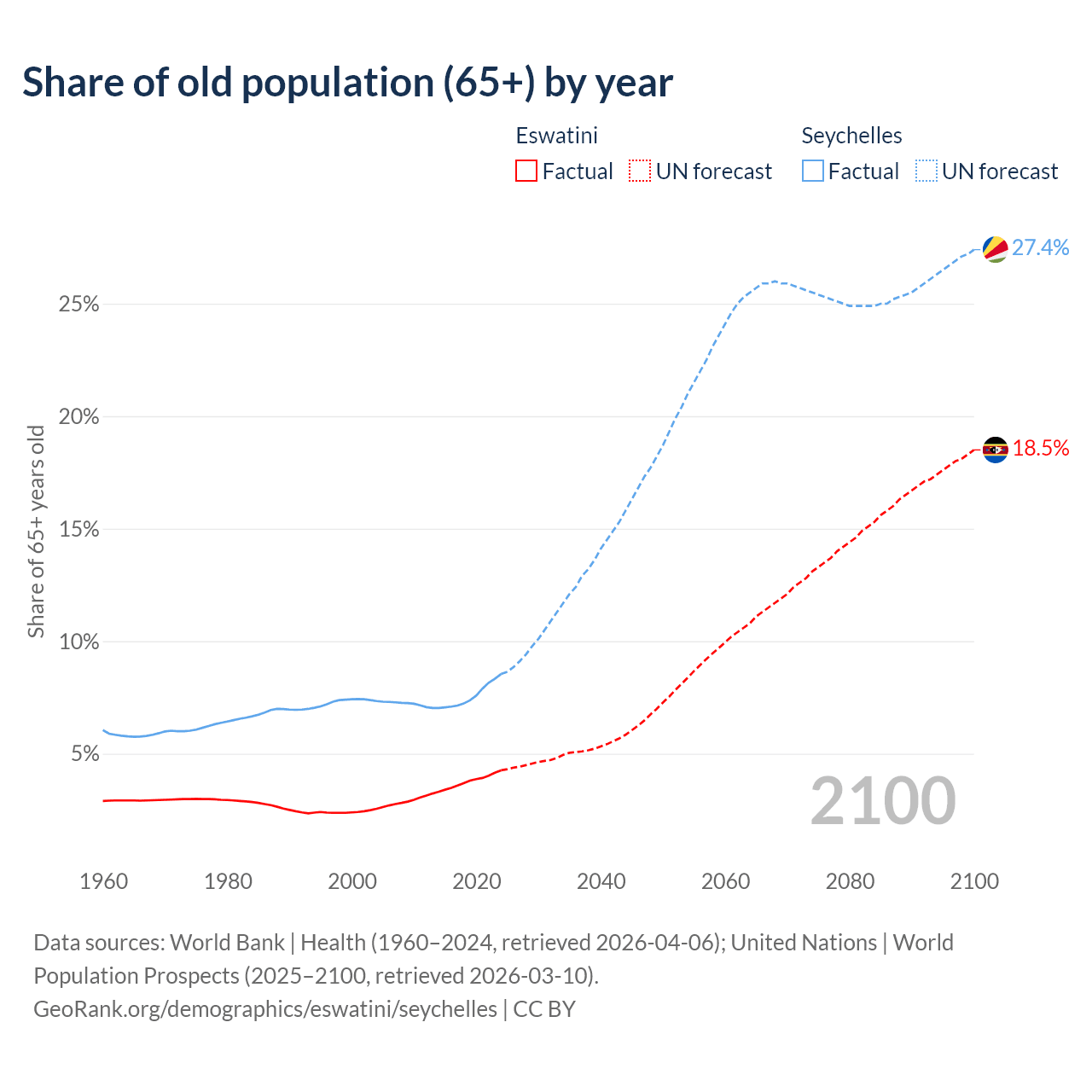 The share of older people aged 65 and over is 4.26% in Eswatini and 8.54% in the Seychelles. Life expectancy in Eswatini compared to the Seychelles .