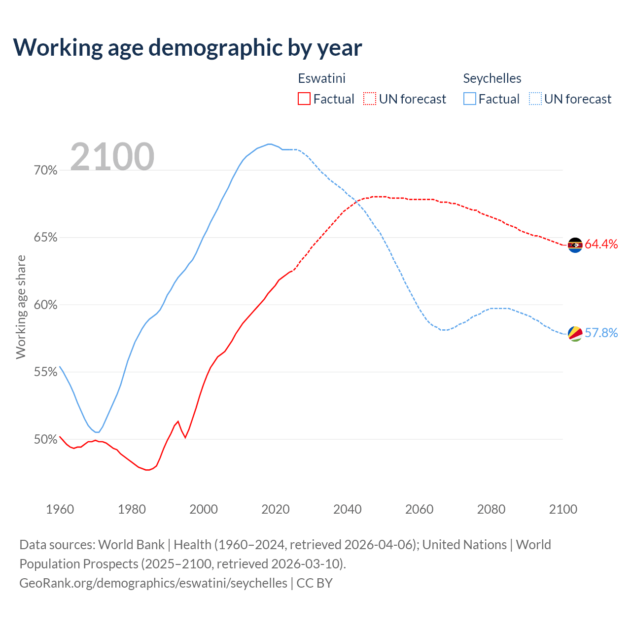 Median age Eswatini vs Seychelles, 1960-2100