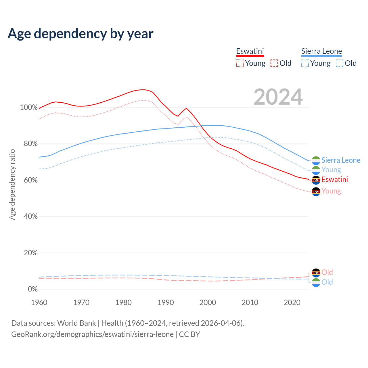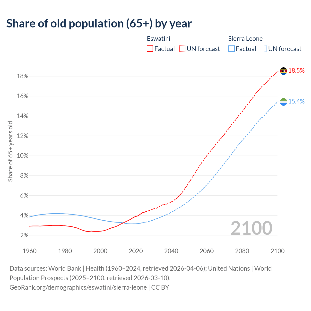 - The share of old-age demographic (65+) in Eswatini is 4.26% vs 3.24% in Sierra Leone.