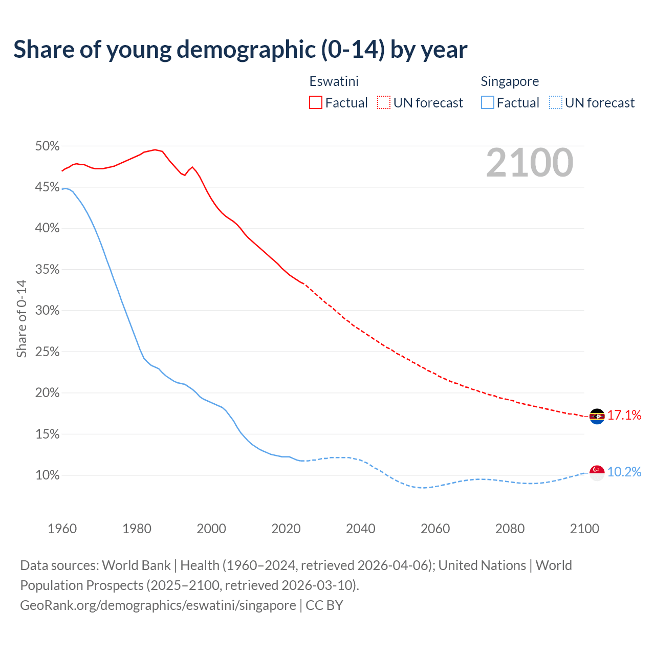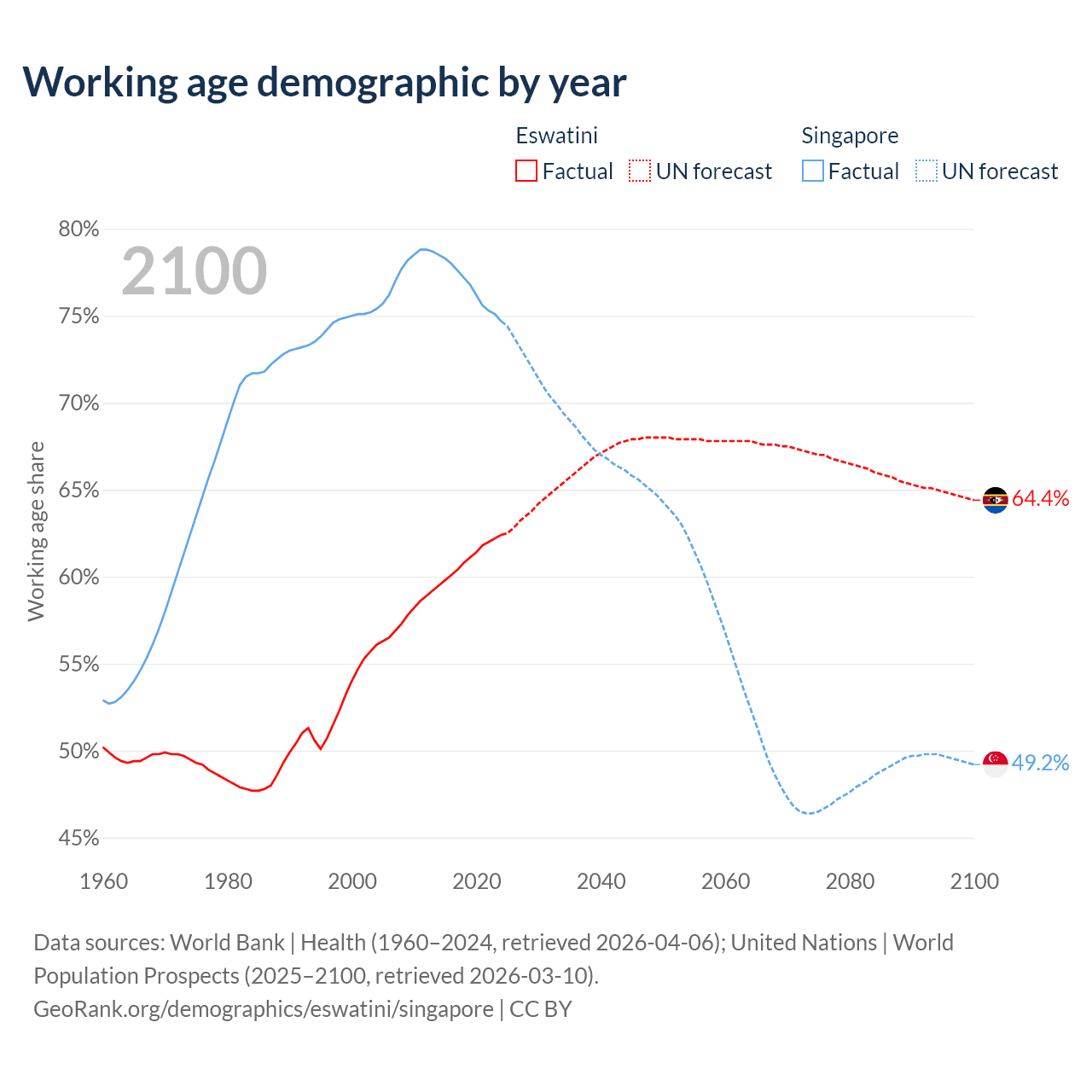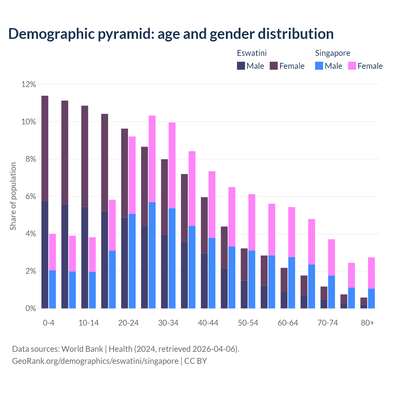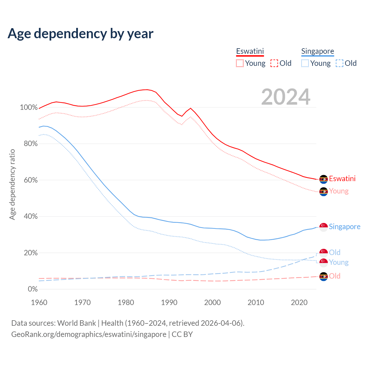 The share of older people aged 65 and over is 4.26% in Eswatini and 13.7% in Singapore. Life expectancy in Eswatini compared to Singapore .