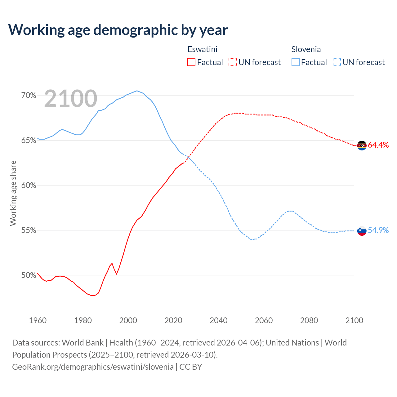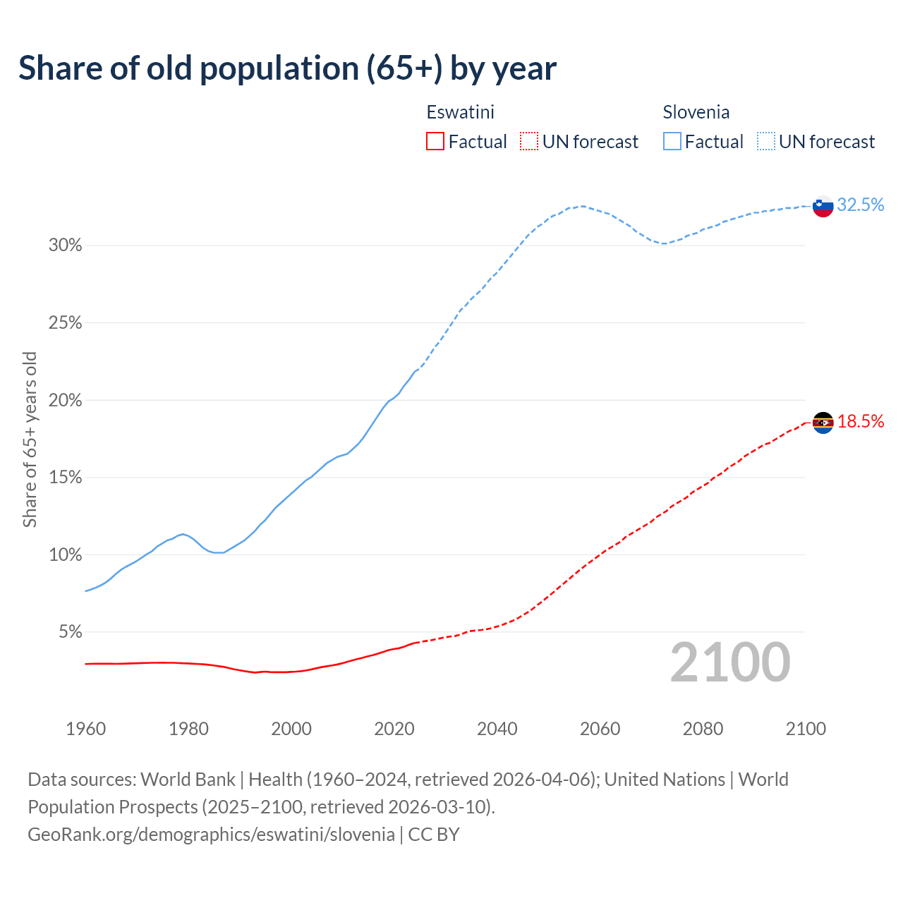 - The share of old-age demographic (65+) in Eswatini is 4.26% vs 21.8% in Slovenia.