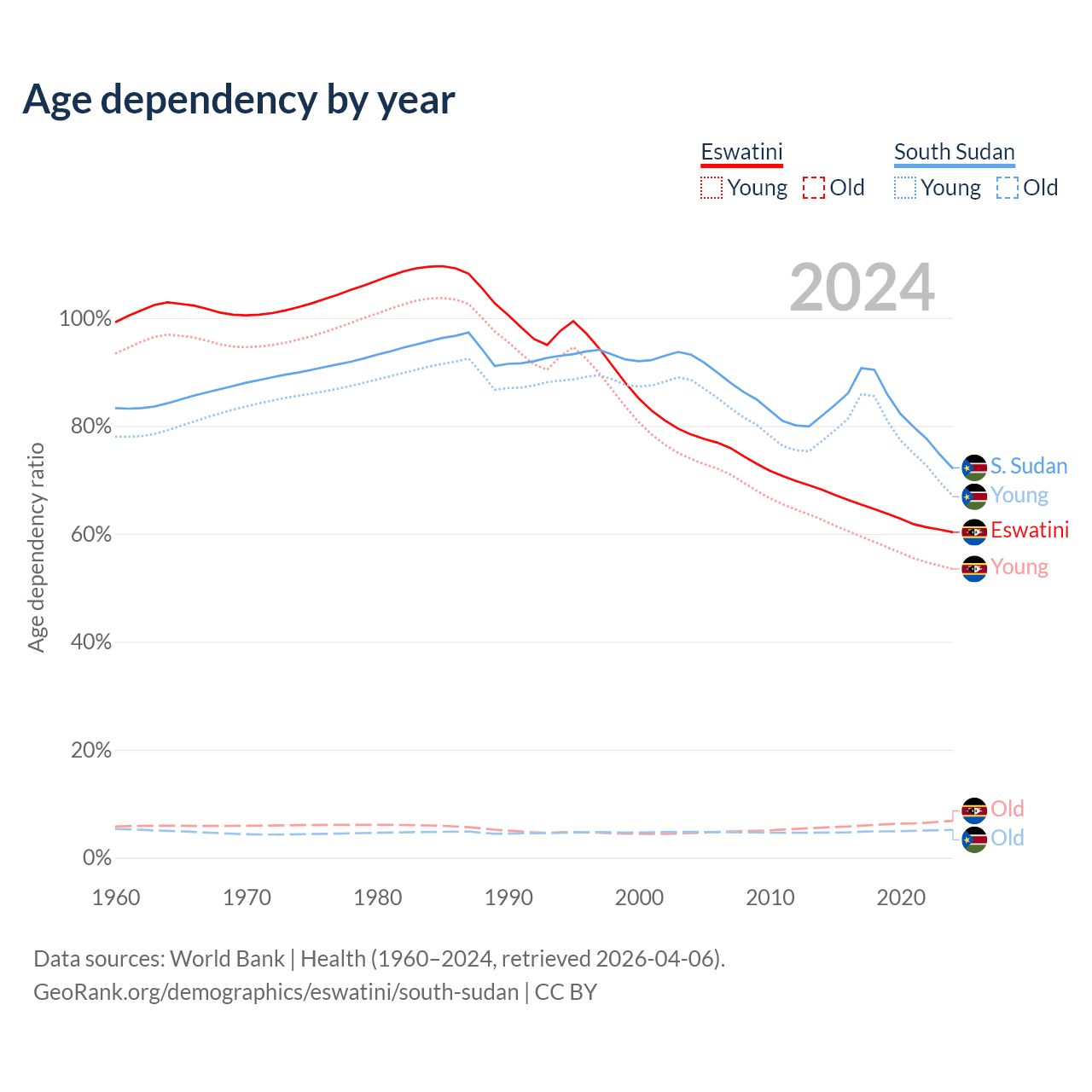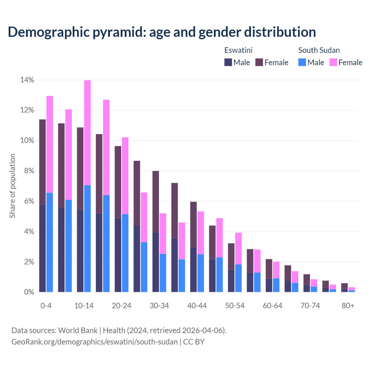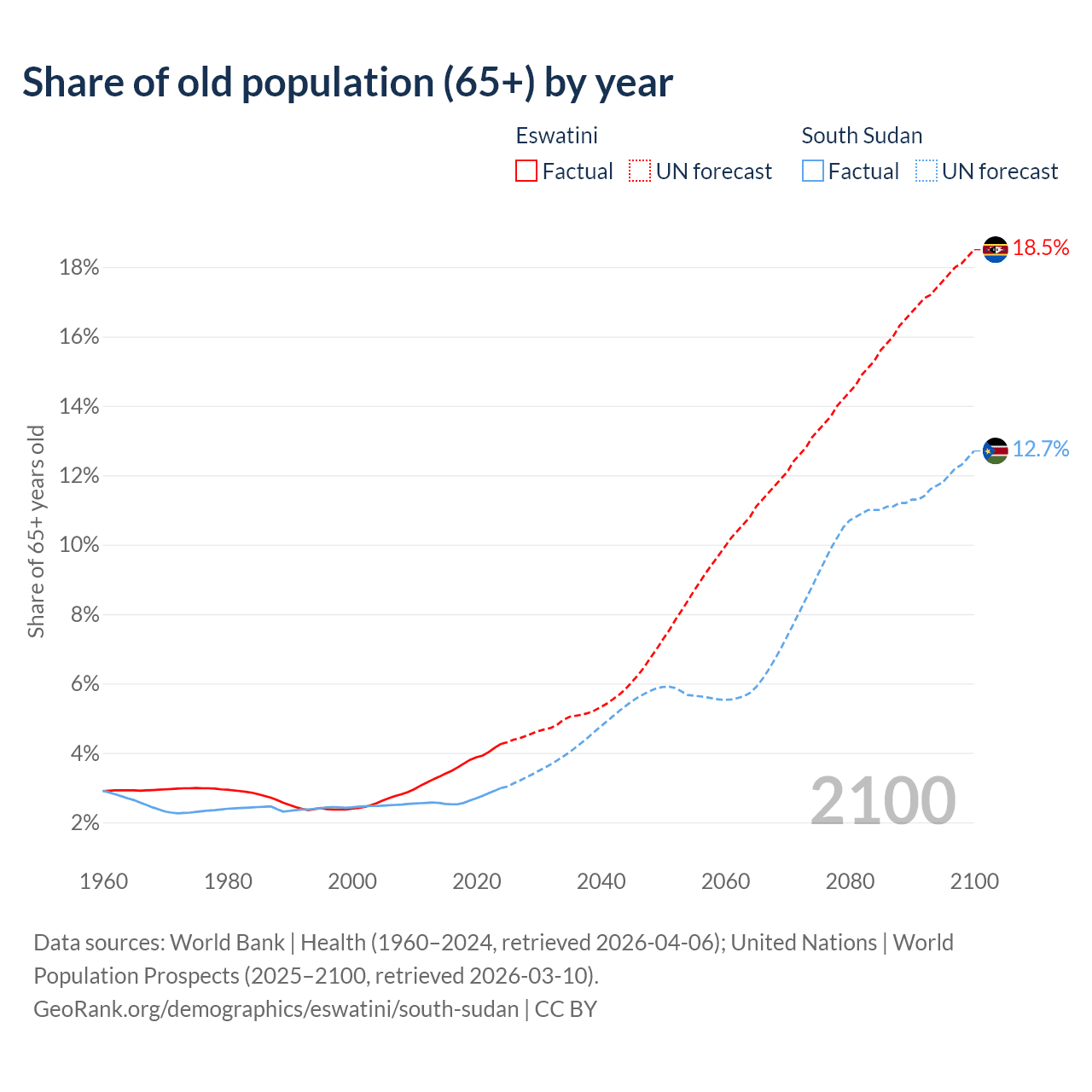 - The share of old-age demographic (65+) in Eswatini is 4.26% vs 2.99% in South Sudan.