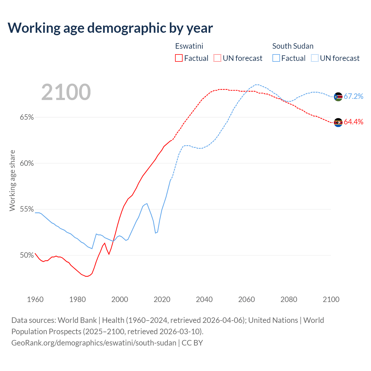 - Eswatini has 794K working age adults (aged 15-64) vs 7.27M in South Sudan.