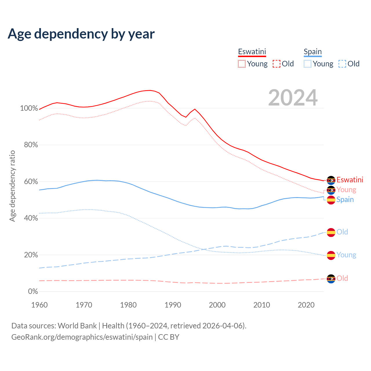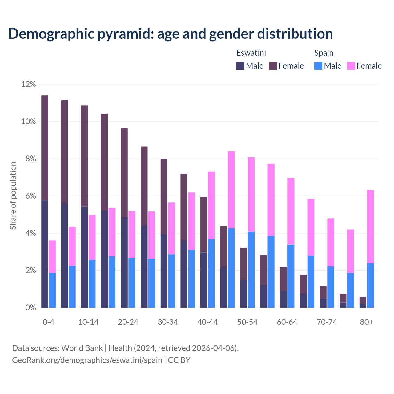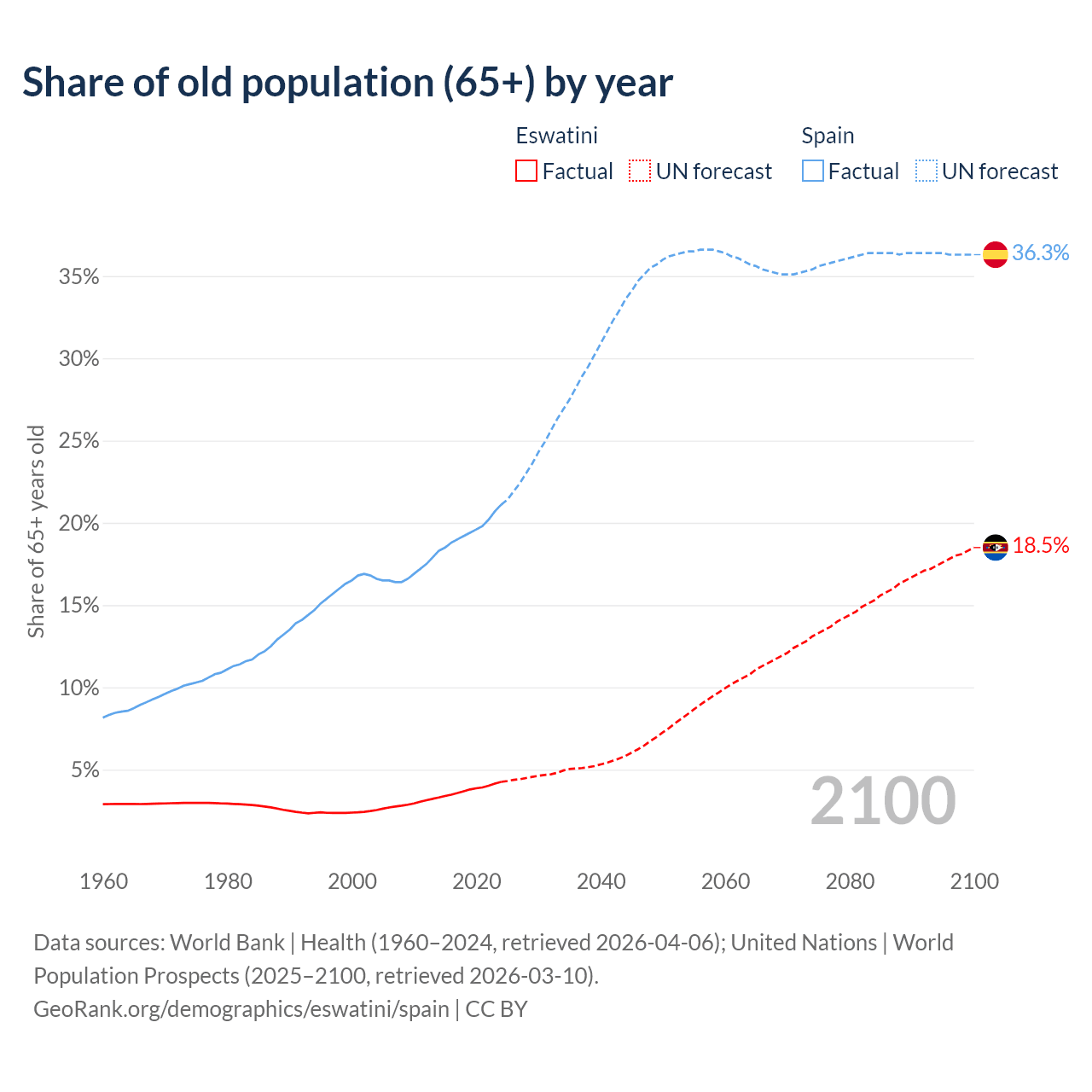 The share of older people aged 65 and over is 4.26% in Eswatini and 21.1% in Spain. Life expectancy in Eswatini compared to Spain .