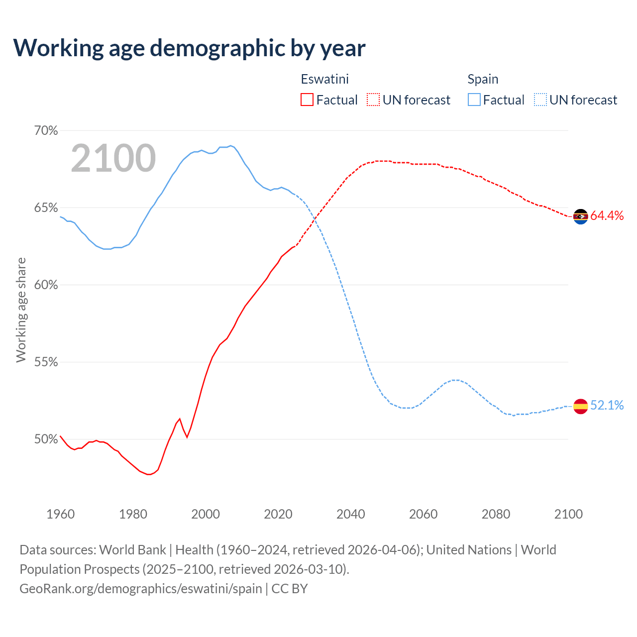 - Eswatini has 794K working age adults (aged 15-64) vs 32.2M in Spain.