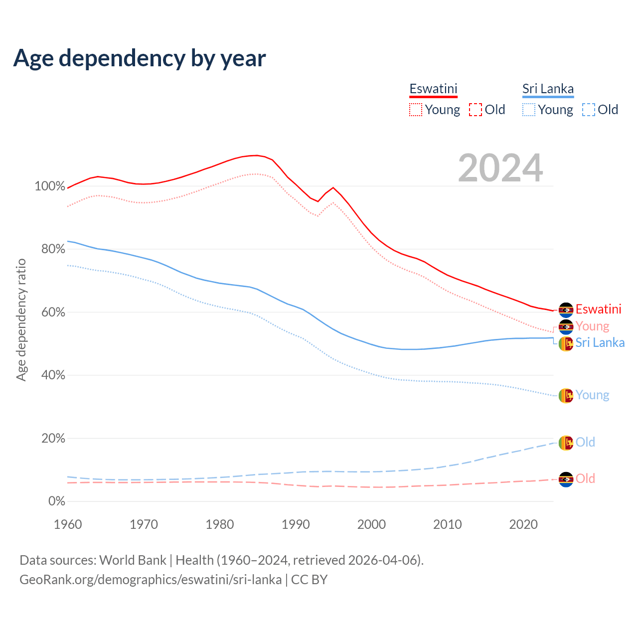 - The share of old-age demographic (65+) in Eswatini is 4.26% vs 12.1% in Sri Lanka.