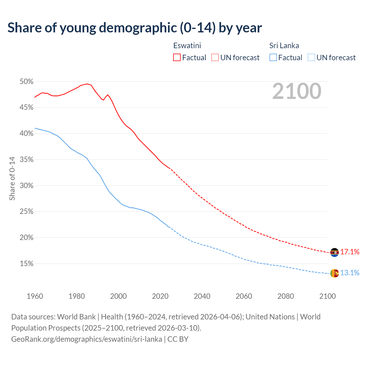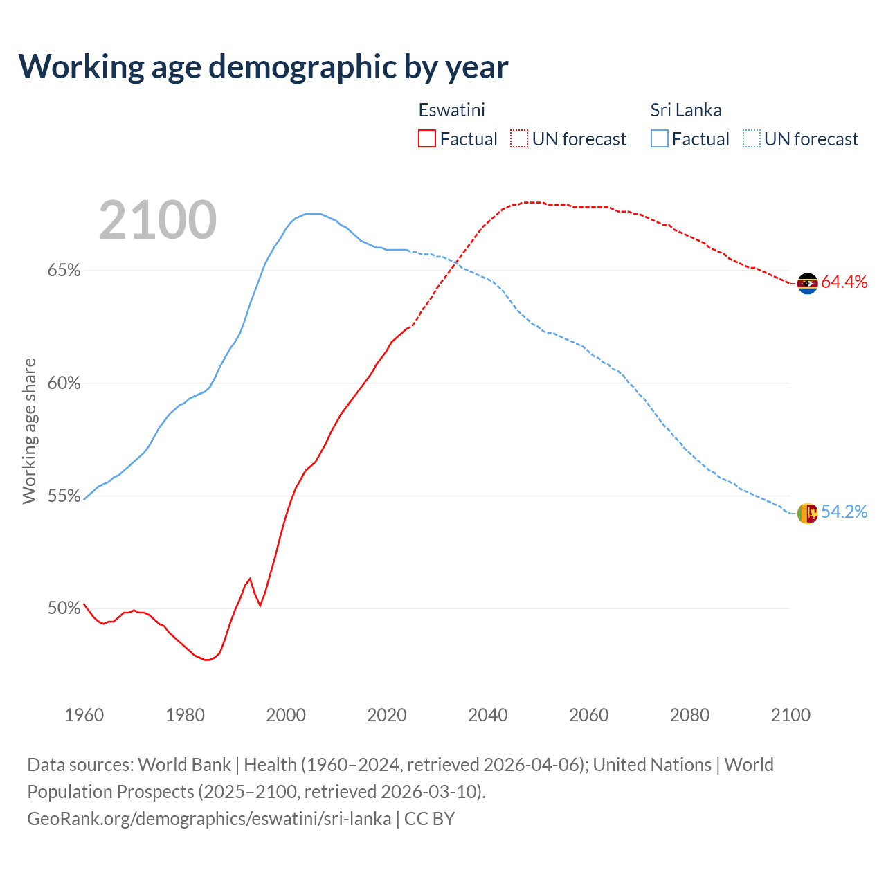 Median age Eswatini vs Sri Lanka, 1960-2100