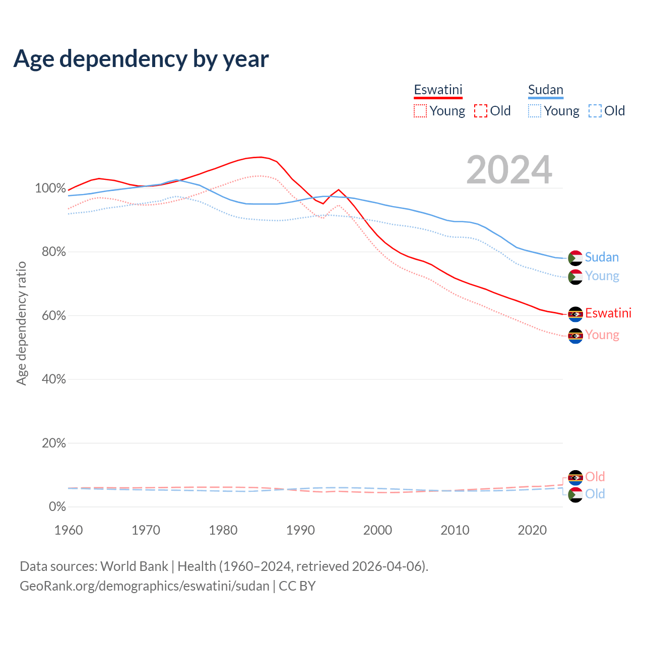 - The share of old-age demographic (65+) in Eswatini is 4.26% vs 3.3% in Sudan.
