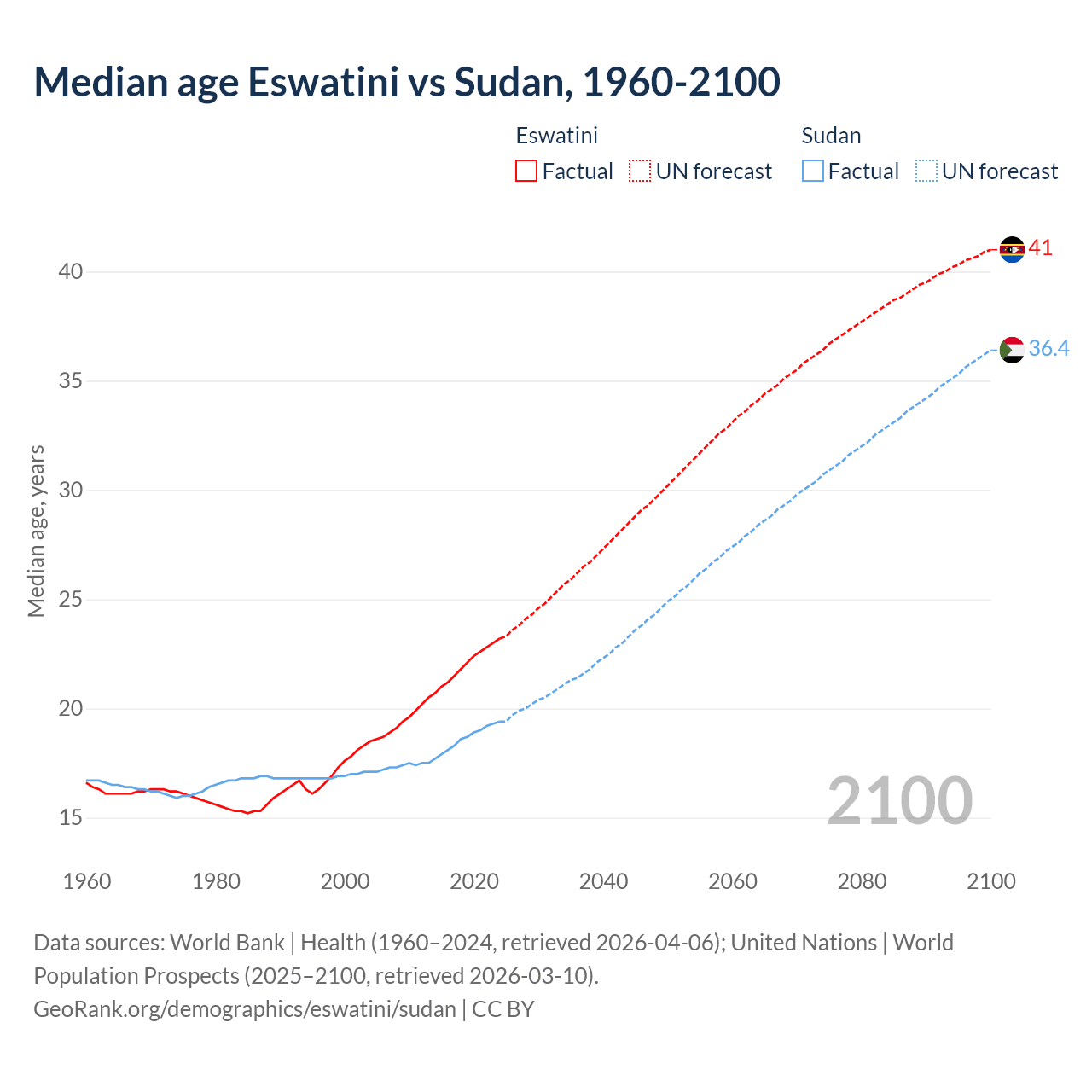 - Eswatini is ranked 141/196 by median age (oldest to youngest) vs 172/196 for Sudan.