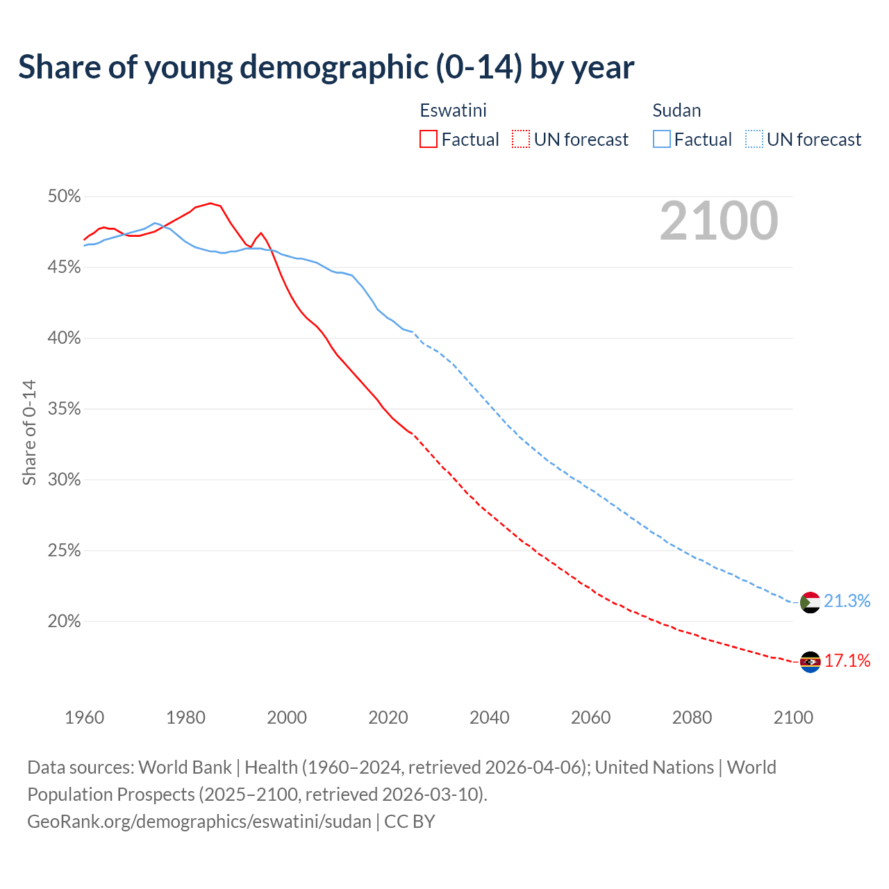 - The share of young demographic (0-15 years old) in Eswatini is 33.4% vs 40.5% in Sudan.