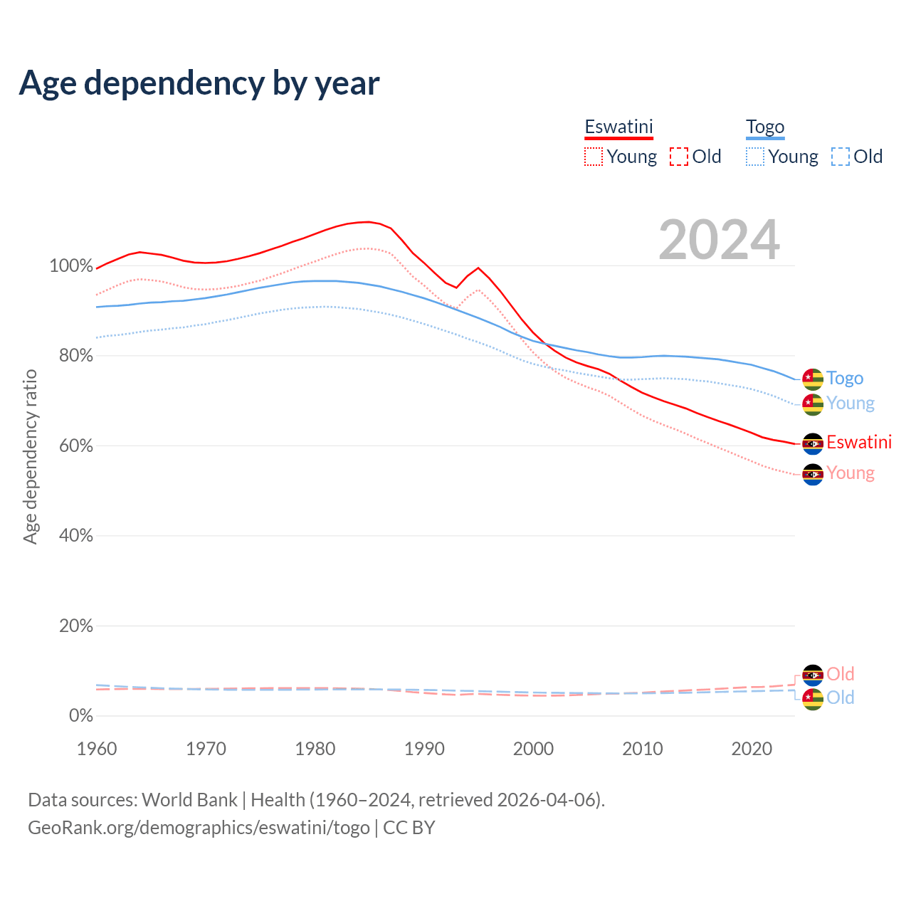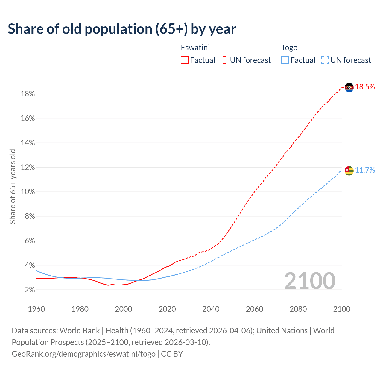 - The share of old-age demographic (65+) in Eswatini is 4.26% vs 3.21% in Togo.
