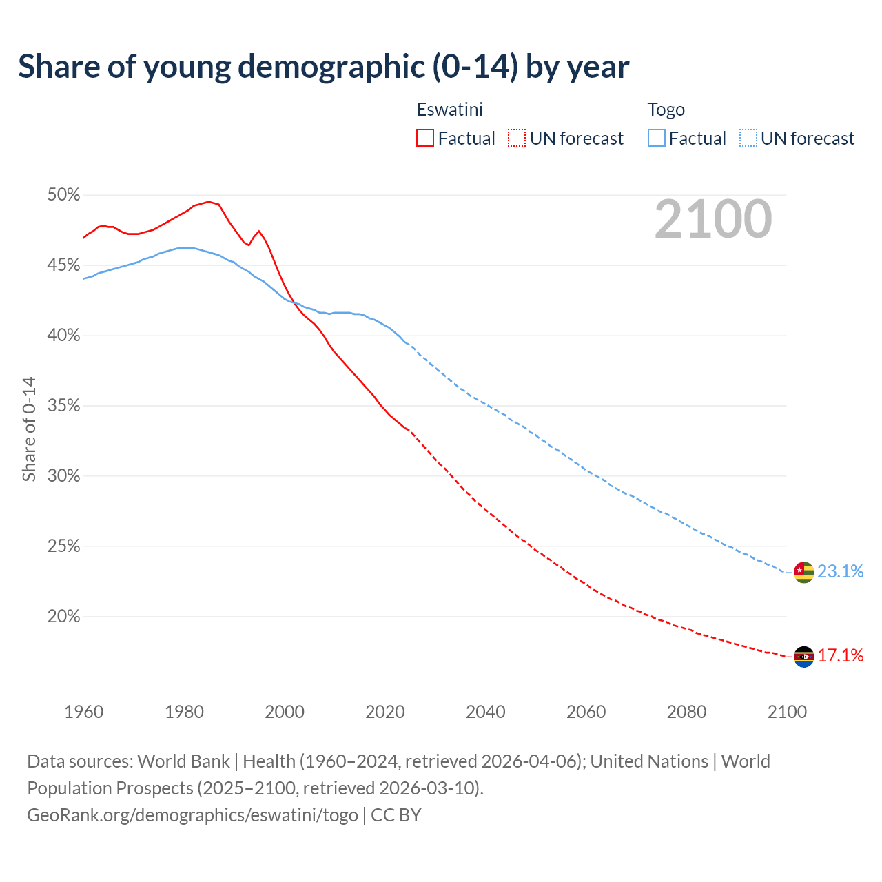 - The share of young demographic (0-15 years old) in Eswatini is 33.4% vs 39.5% in Togo.
