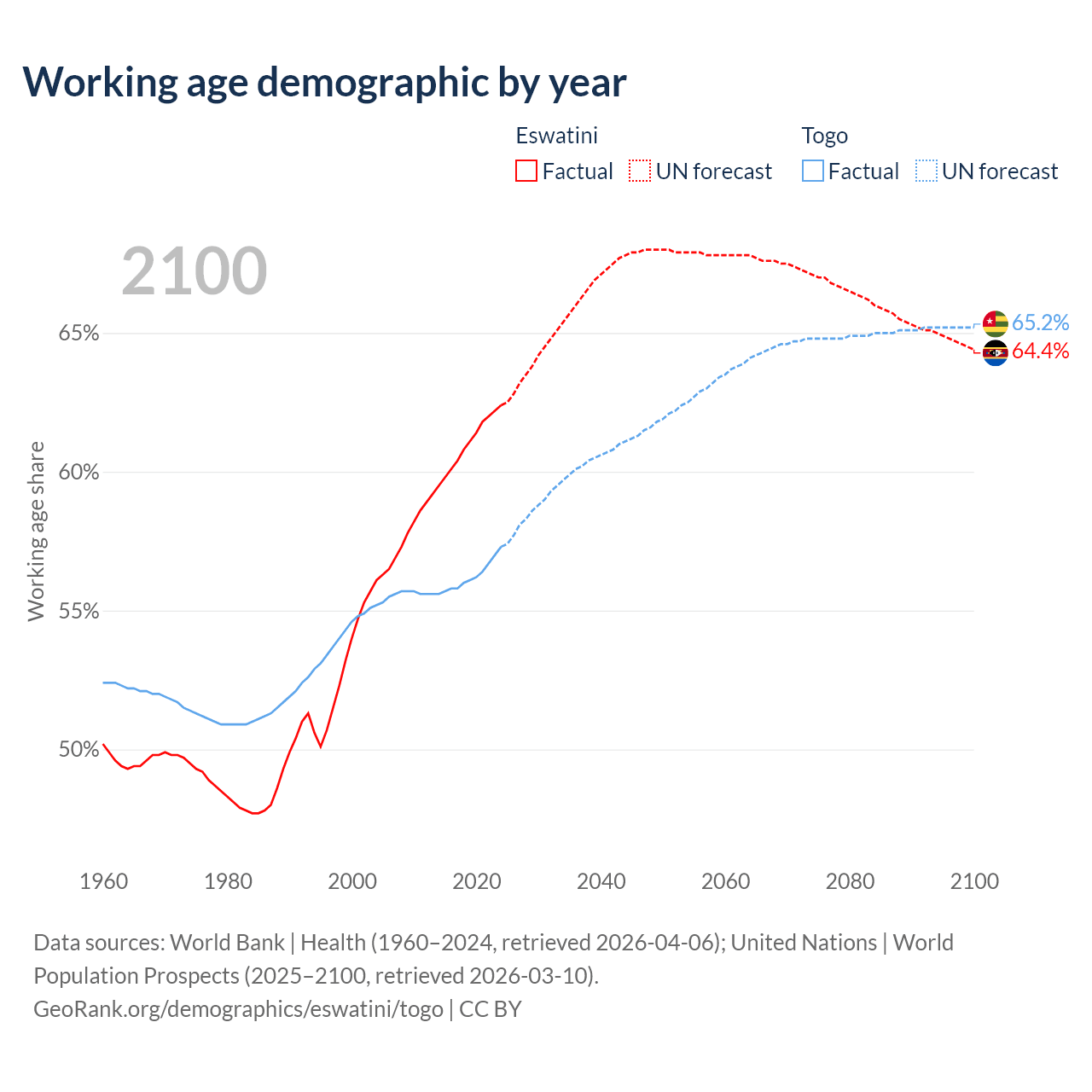 - Eswatini has 794K working age adults (aged 15-64) vs 5.72M in Togo.