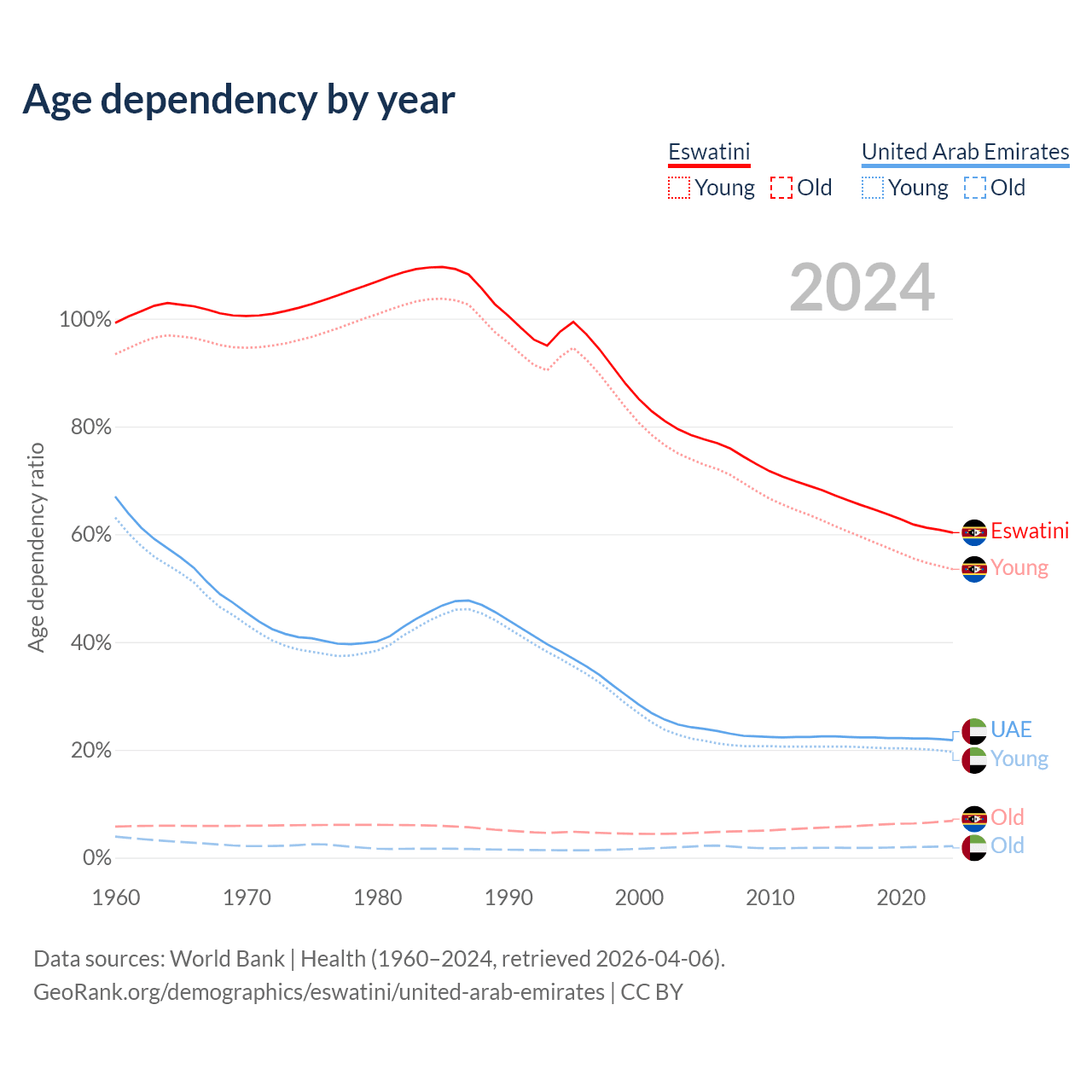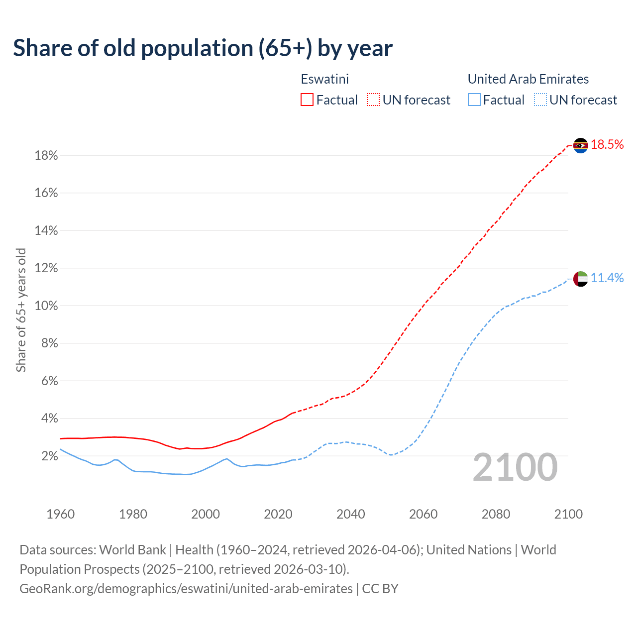 - The share of old-age demographic (65+) in Eswatini is 4.26% vs 1.77% in the United Arab Emirates.