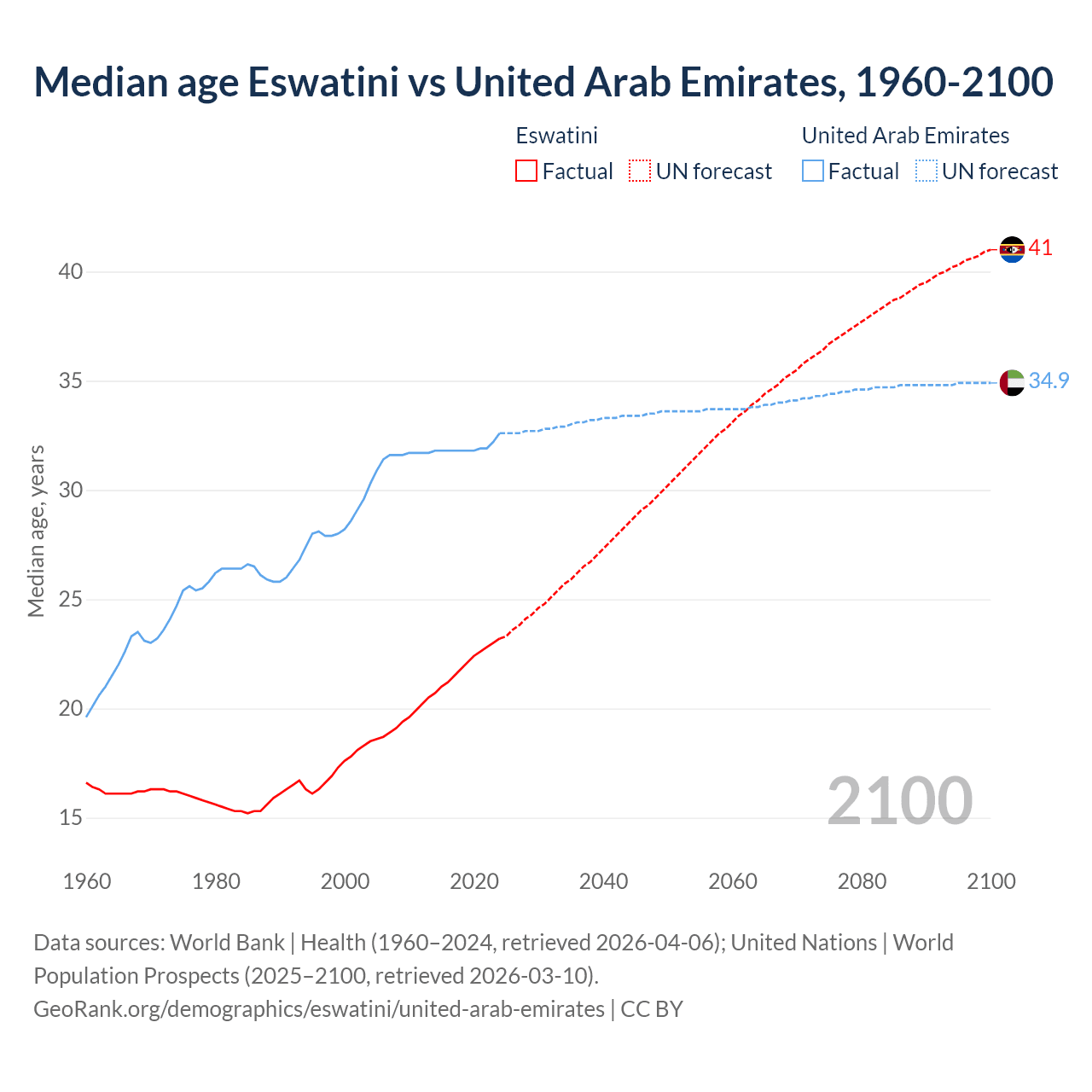 Median age Eswatini vs United Arab Emirates, 1960-2100