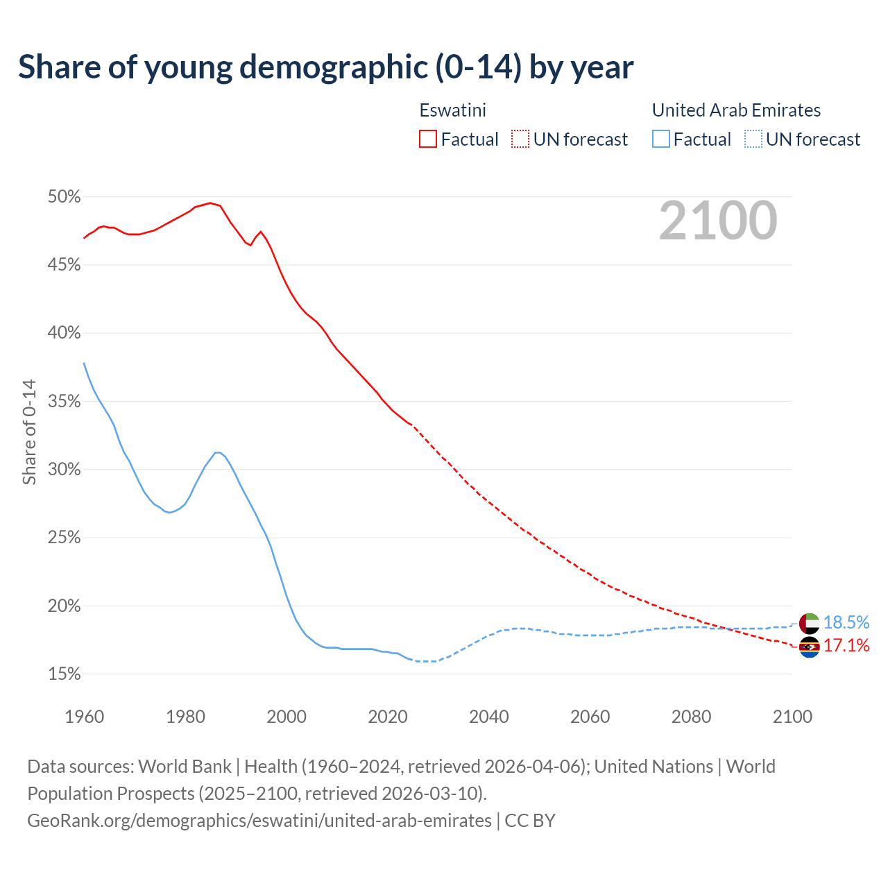 - The share of young demographic (0-15 years old) in Eswatini is 33.4% vs 16.1% in the United Arab Emirates.