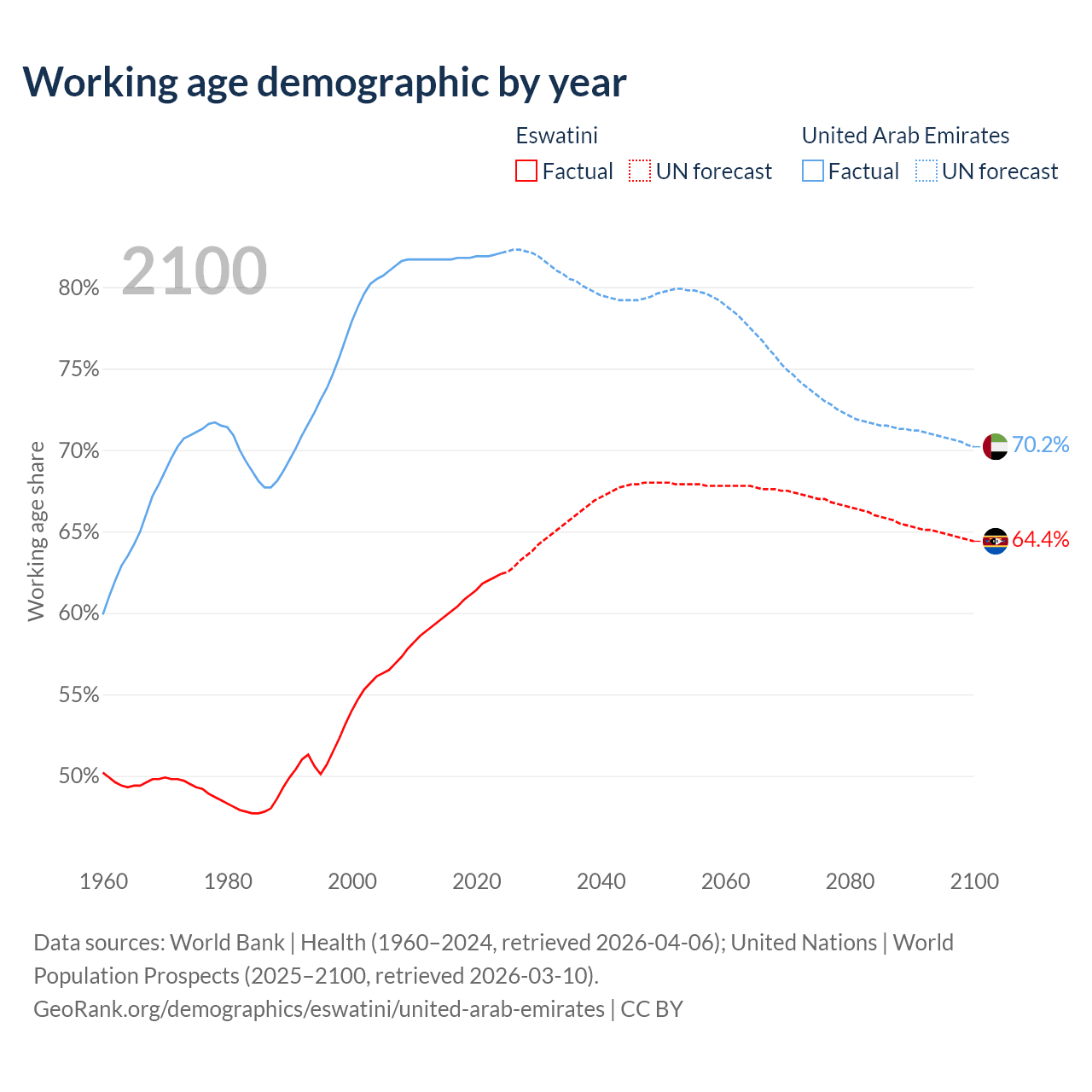 The share of older people aged 65 and over is 4.26% in Eswatini and 1.77% in the United Arab Emirates. Life expectancy in Eswatini compared to the United Arab Emirates .
