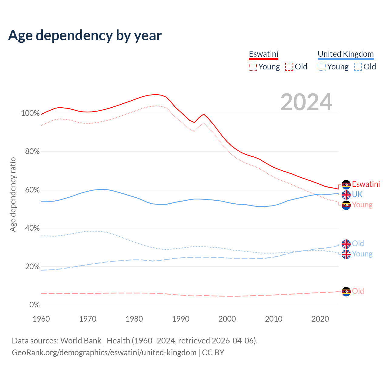 The share of older people aged 65 and over is 4.26% in Eswatini and 19.5% in the United Kingdom. Life expectancy in Eswatini compared to the United Kingdom .