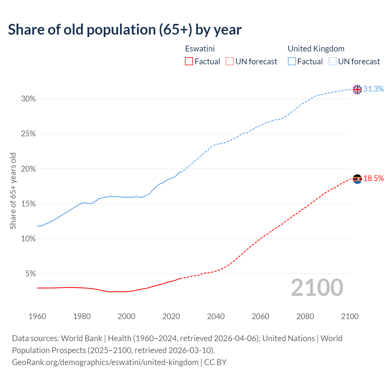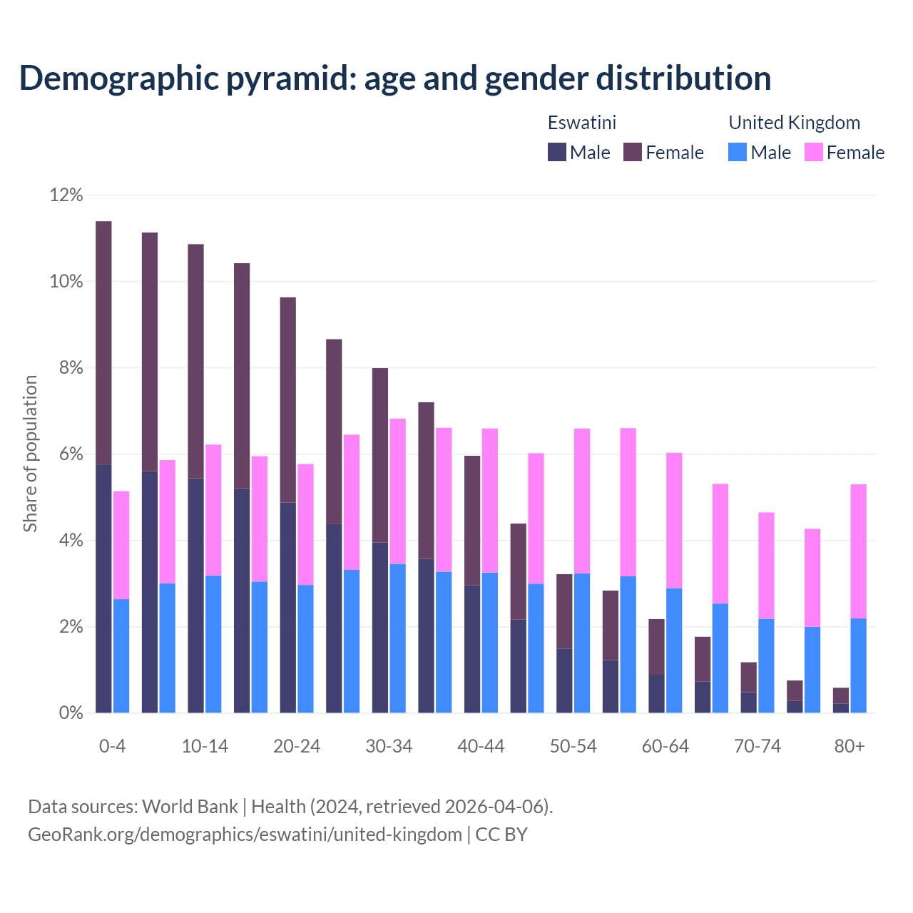 - The share of old-age demographic (65+) in Eswatini is 4.26% vs 19.5% in the United Kingdom.