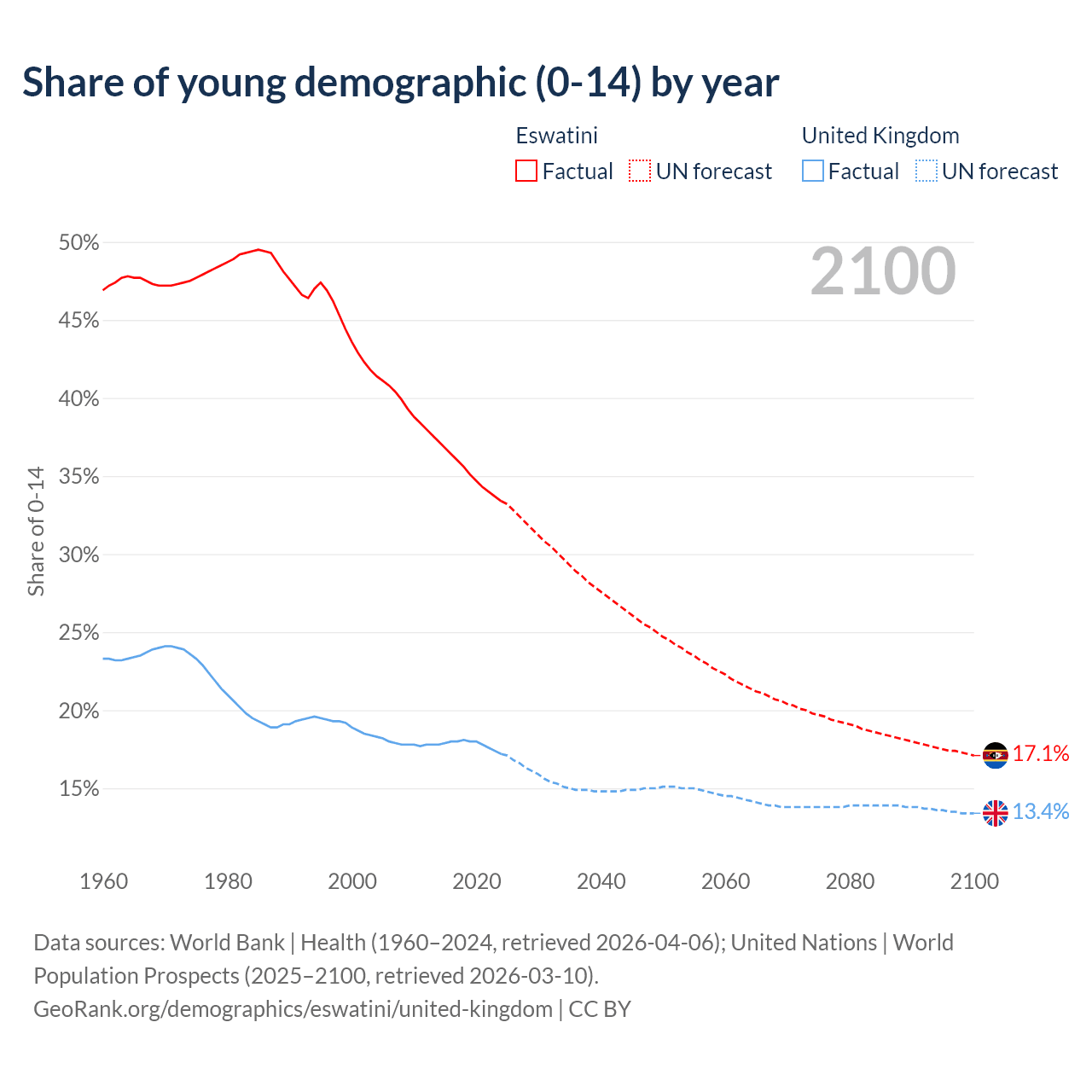 - The share of young demographic (0-15 years old) in Eswatini is 33.4% vs 17.2% in the United Kingdom.