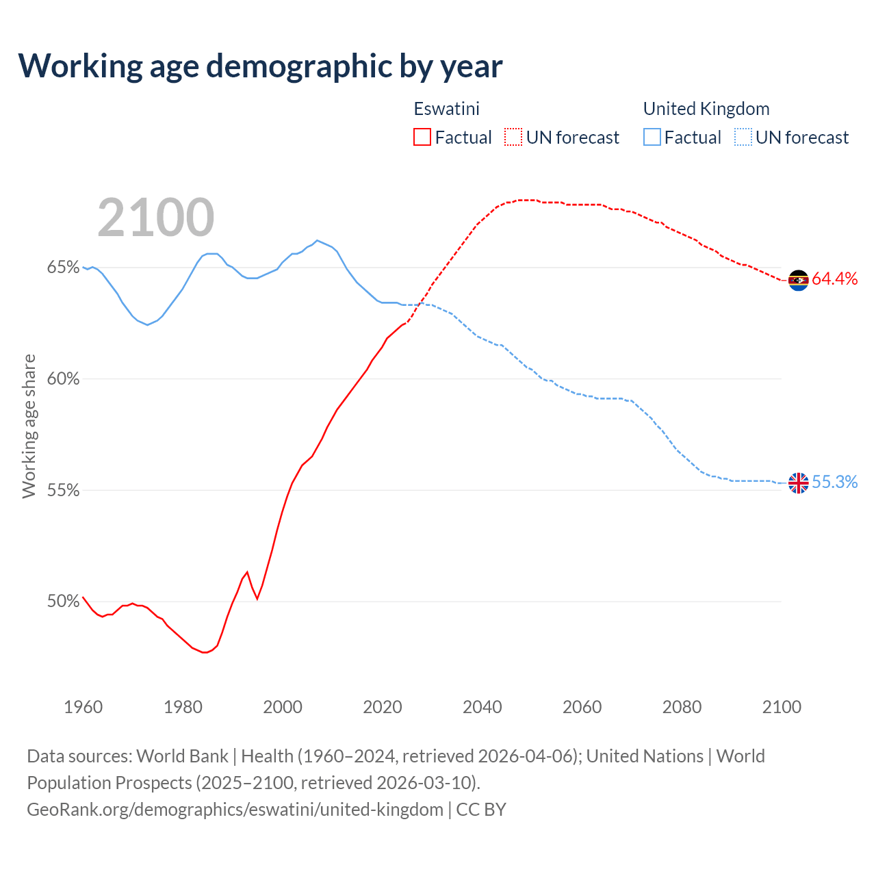 - Eswatini has 794K working age adults (aged 15-64) vs 44.4M in the United Kingdom.