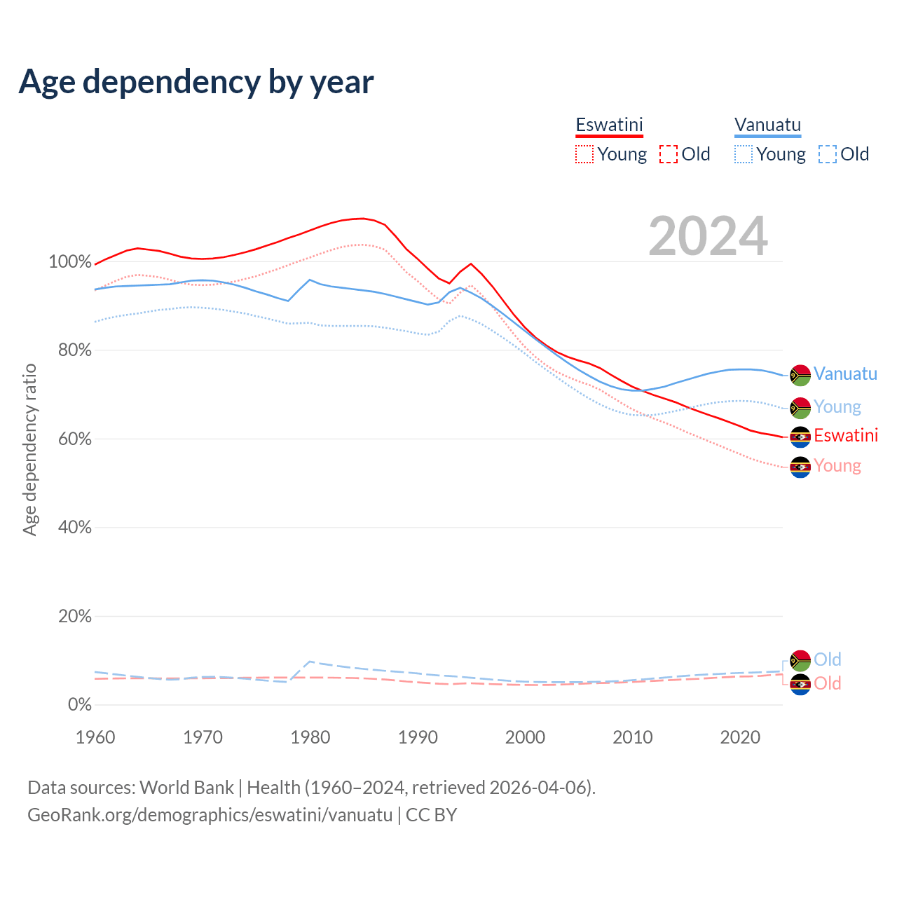 - The share of old-age demographic (65+) in Eswatini is 4.26% vs 4.3% in Vanuatu.