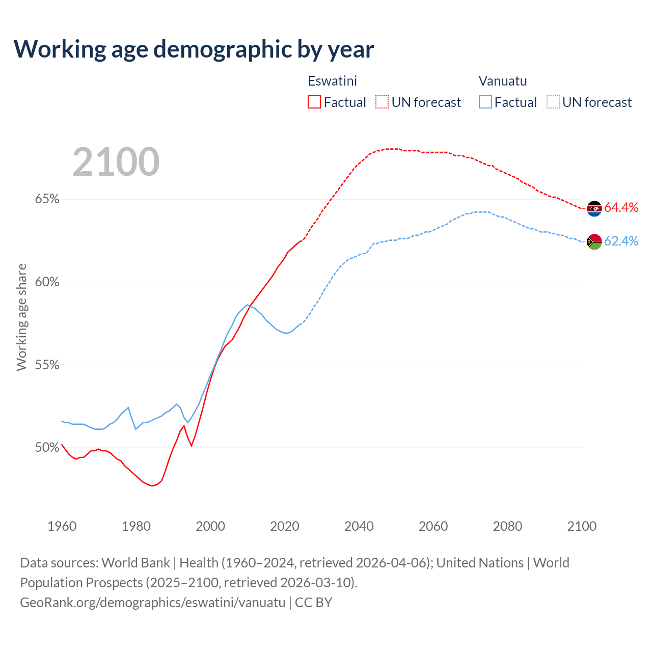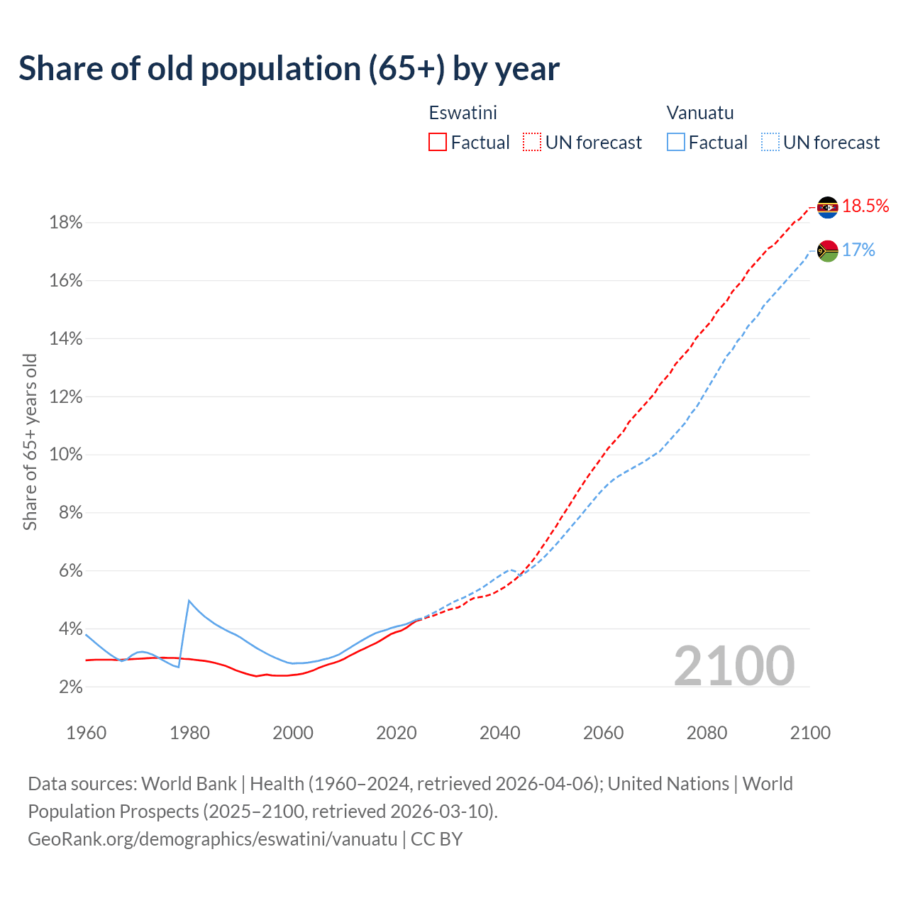 The share of older people aged 65 and over is 4.26% in Eswatini and 4.3% in Vanuatu. Life expectancy in Eswatini compared to Vanuatu .