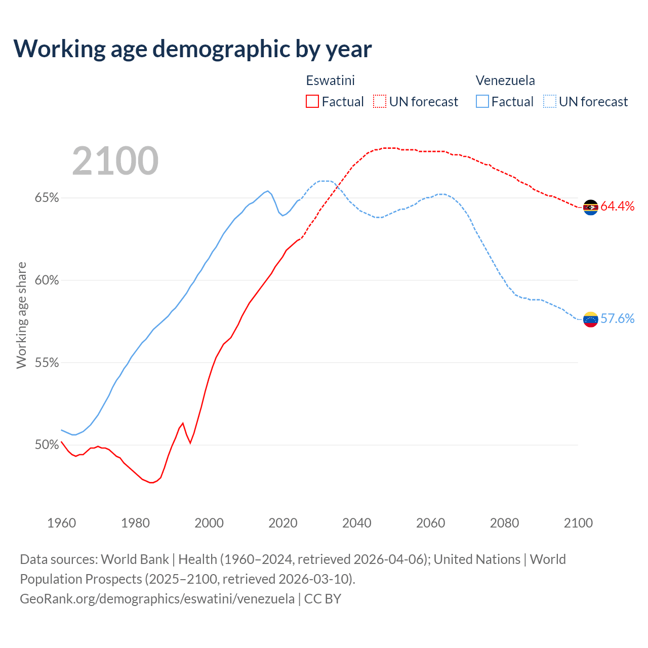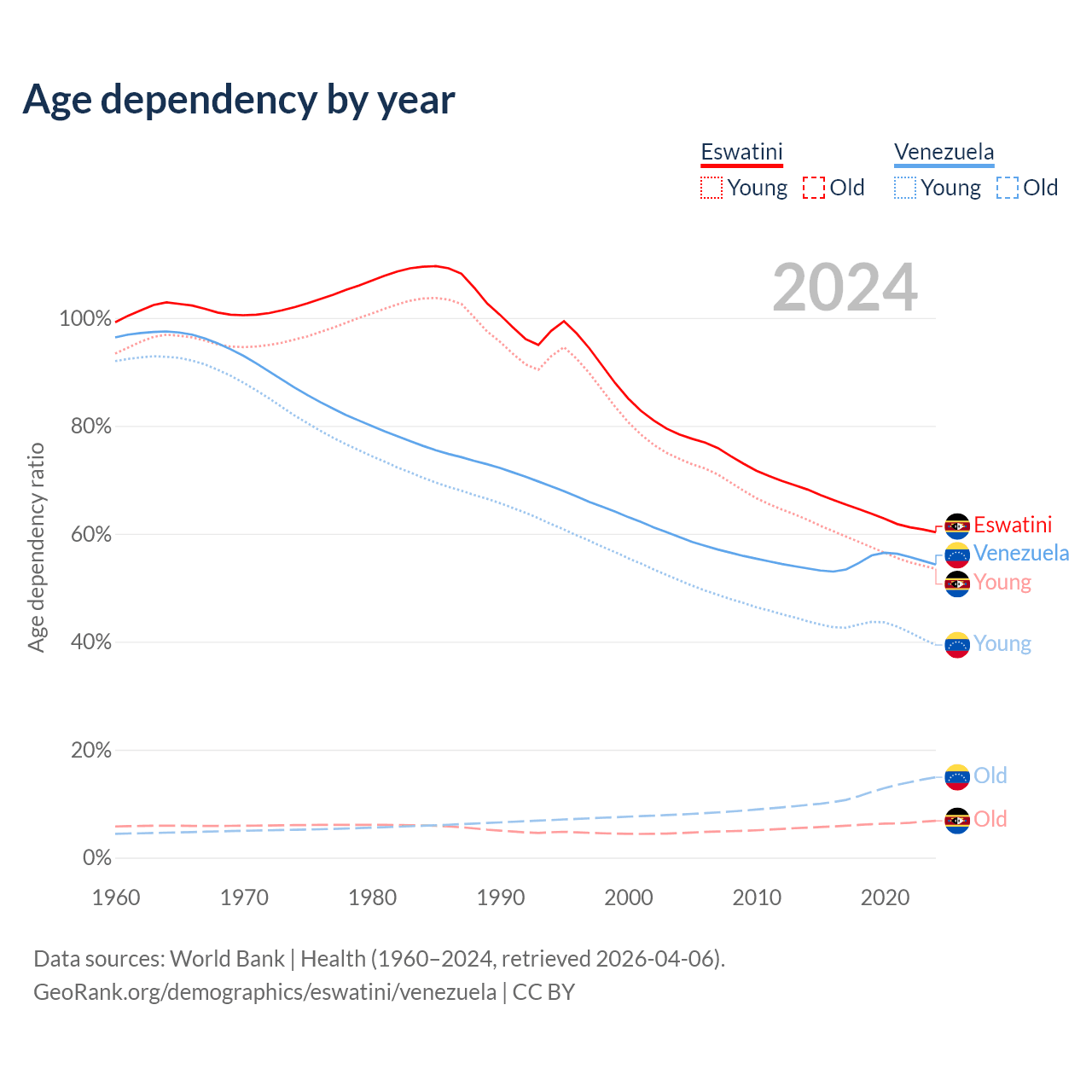 - The share of old-age demographic (65+) in Eswatini is 4.26% vs 9.68% in Venezuela.