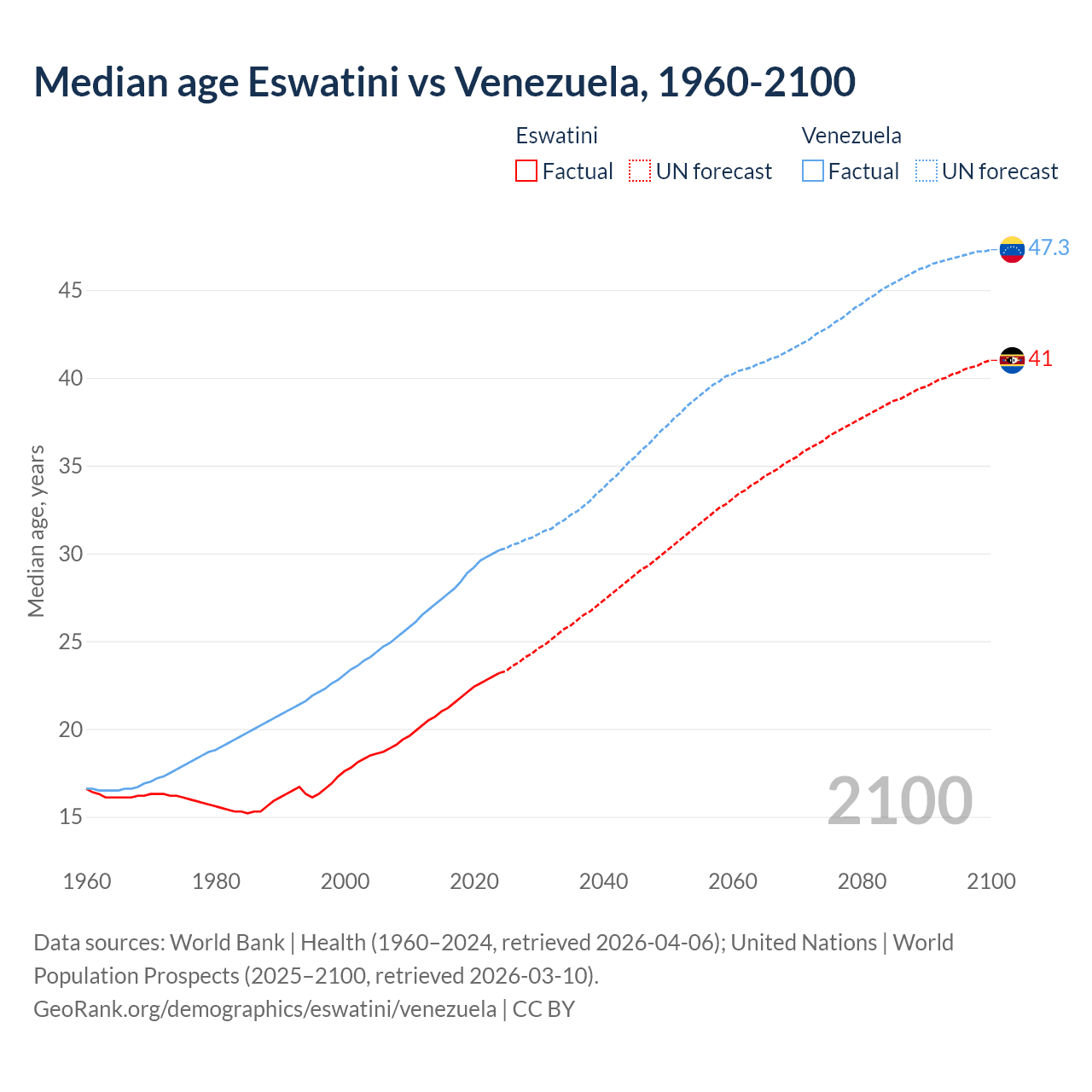 - Eswatini is ranked 141/196 by median age (oldest to youngest) vs 104/196 for Venezuela.