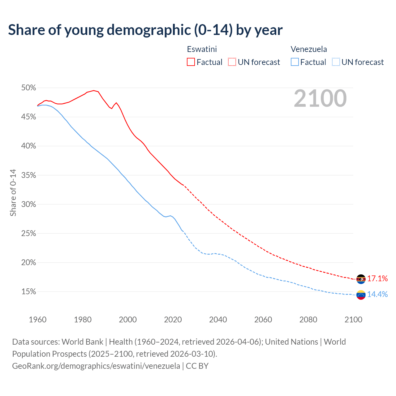- The share of young demographic (0-15 years old) in Eswatini is 33.4% vs 25.5% in Venezuela.