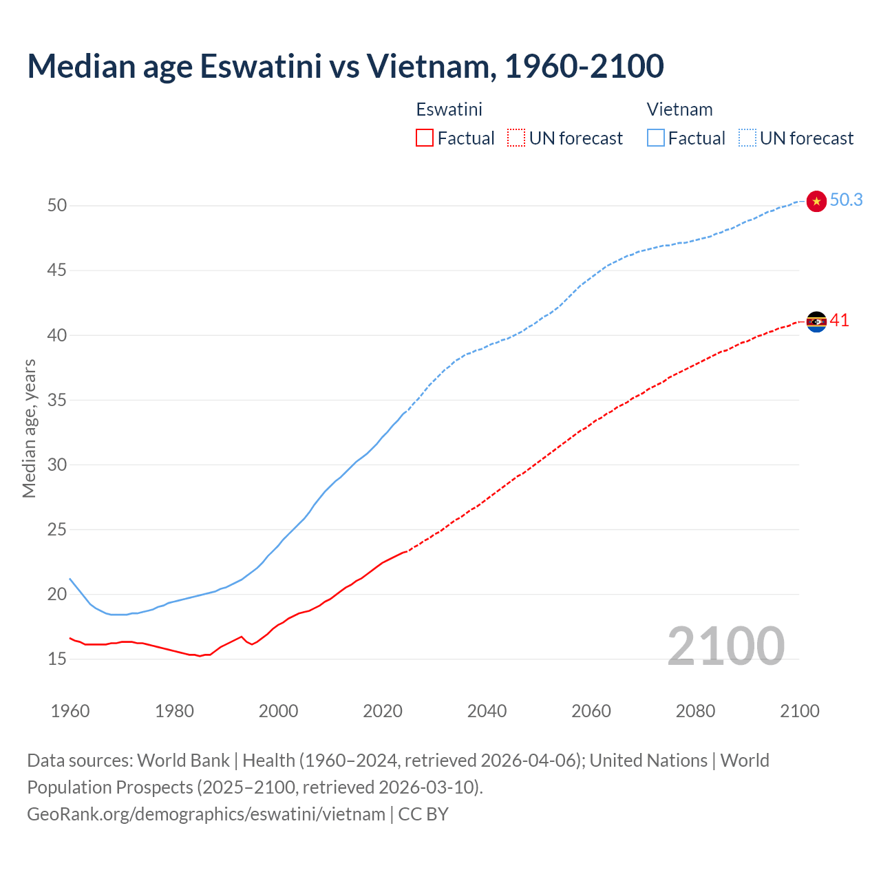 - Eswatini is ranked 141/196 by median age (oldest to youngest) vs 84/196 for Vietnam.