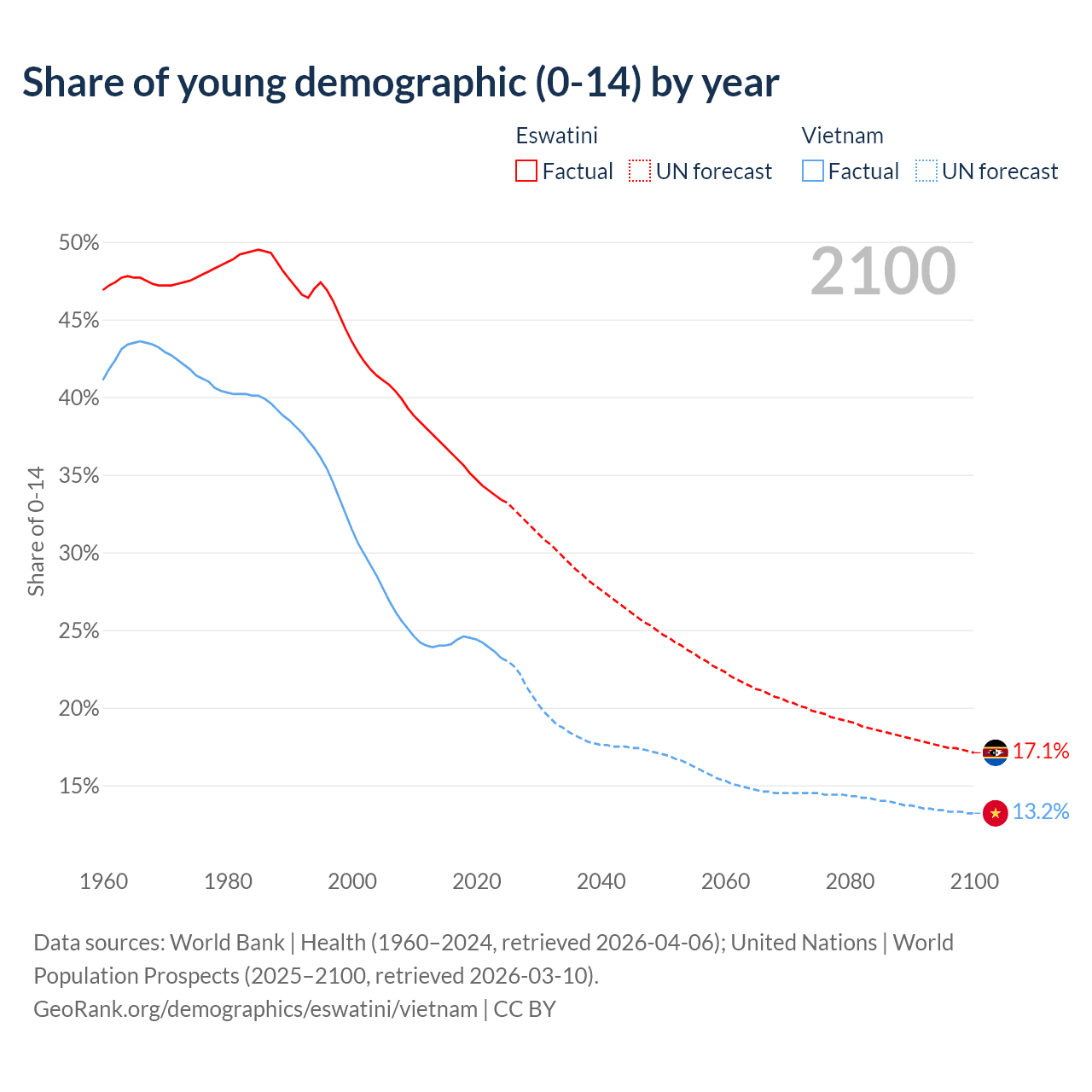- The share of young demographic (0-15 years old) in Eswatini is 33.4% vs 23.2% in Vietnam.