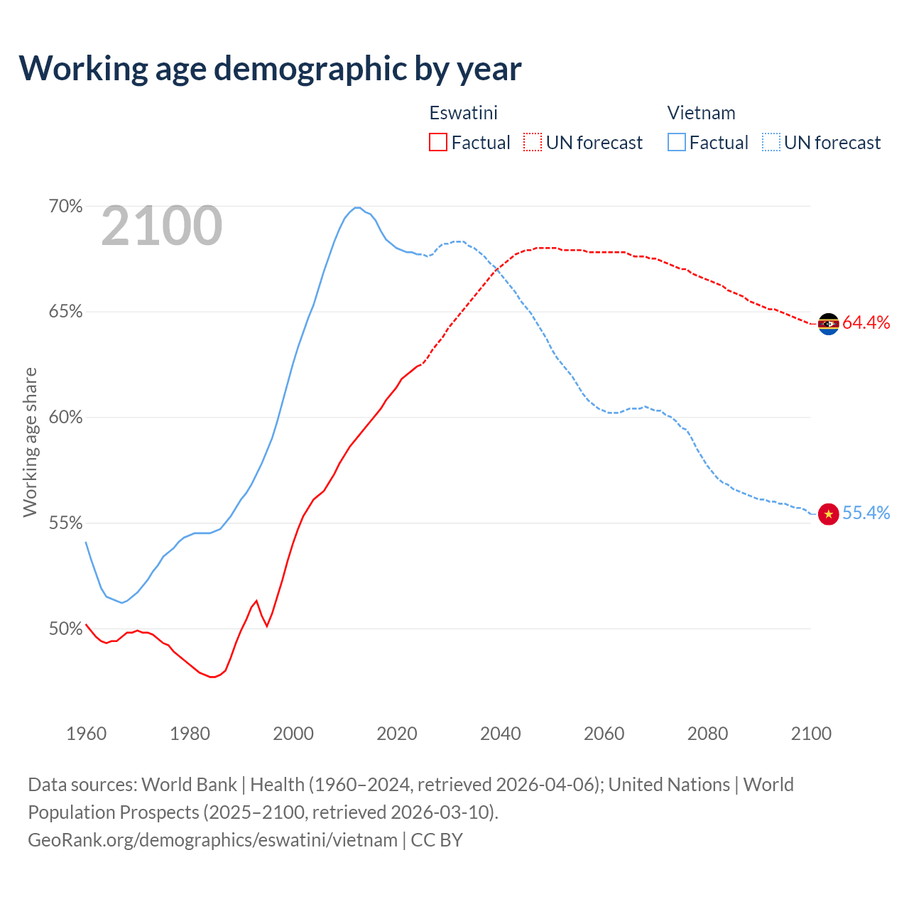 - Eswatini has 794K working age adults (aged 15-64) vs 69.3M in Vietnam.