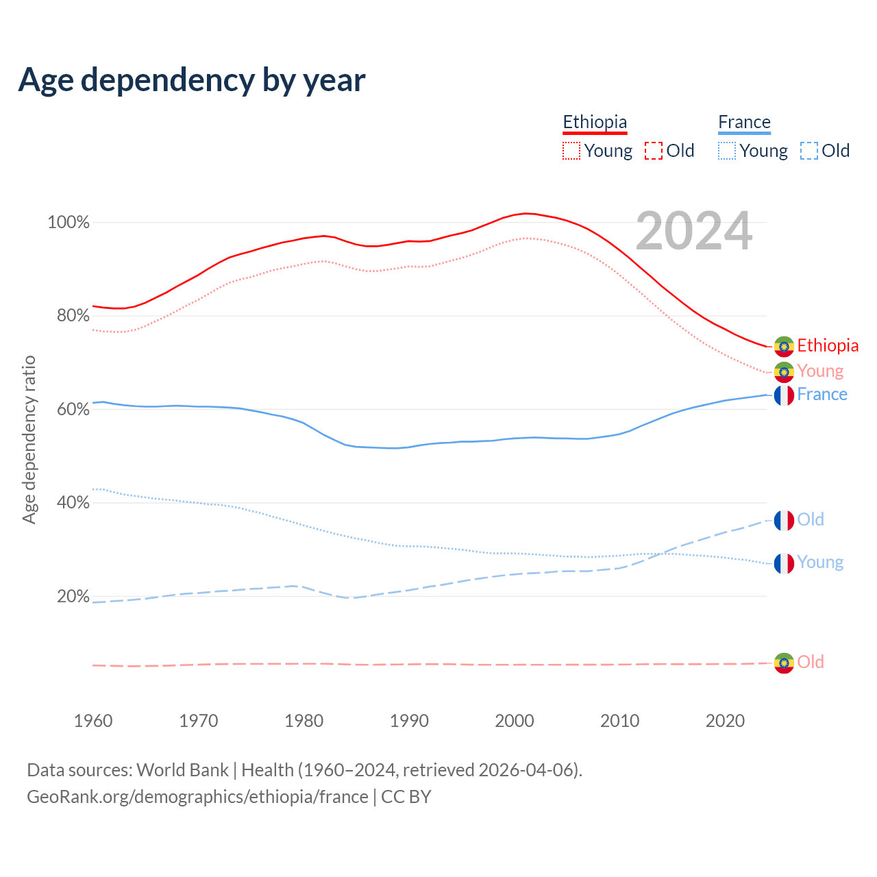 - Ethiopia is ranked 167/196 by median age (oldest to youngest) vs 29/196 for France.