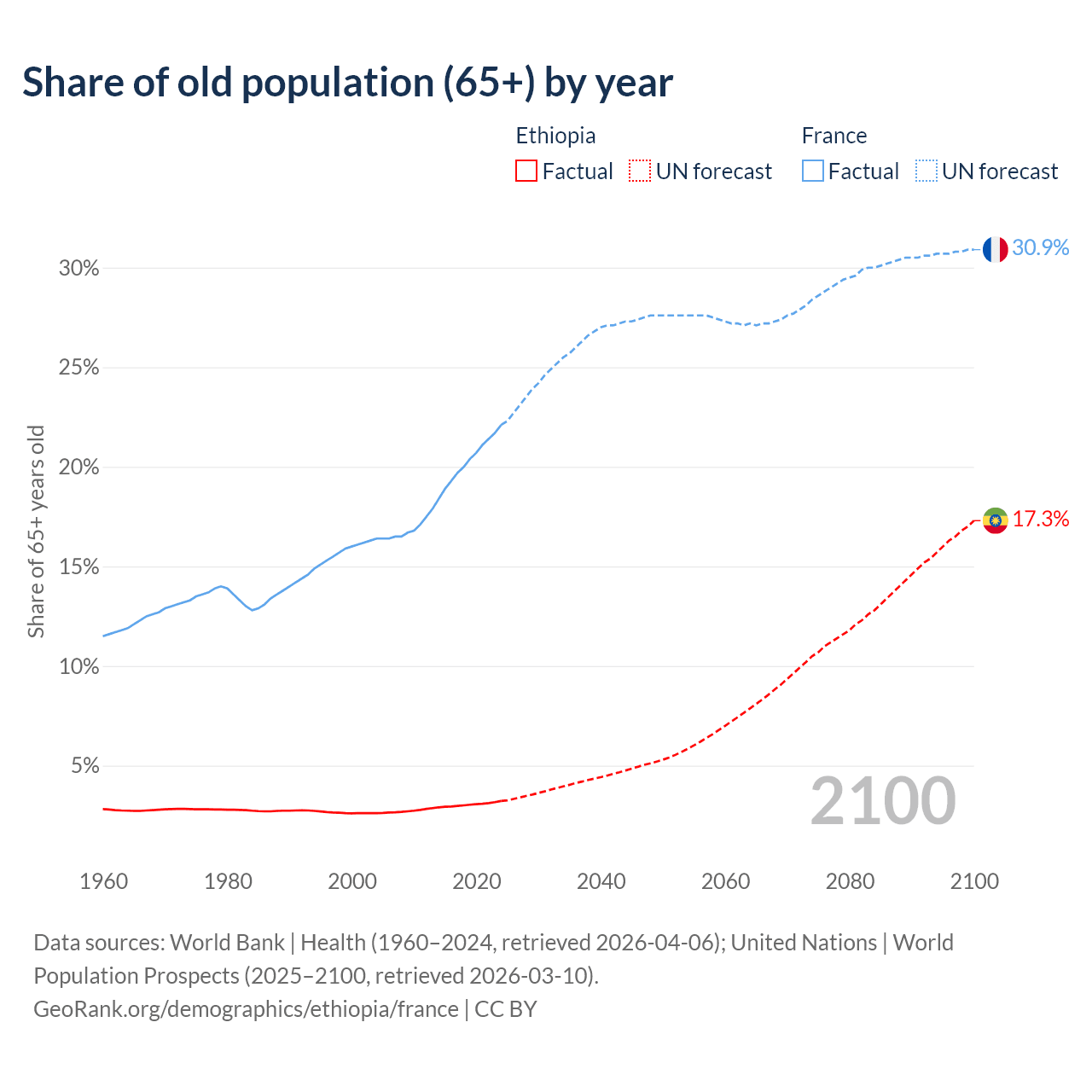 The share of older people aged 65 and over is 3.23% in Ethiopia and 22.1% in France. Life expectancy in Ethiopia compared to France .