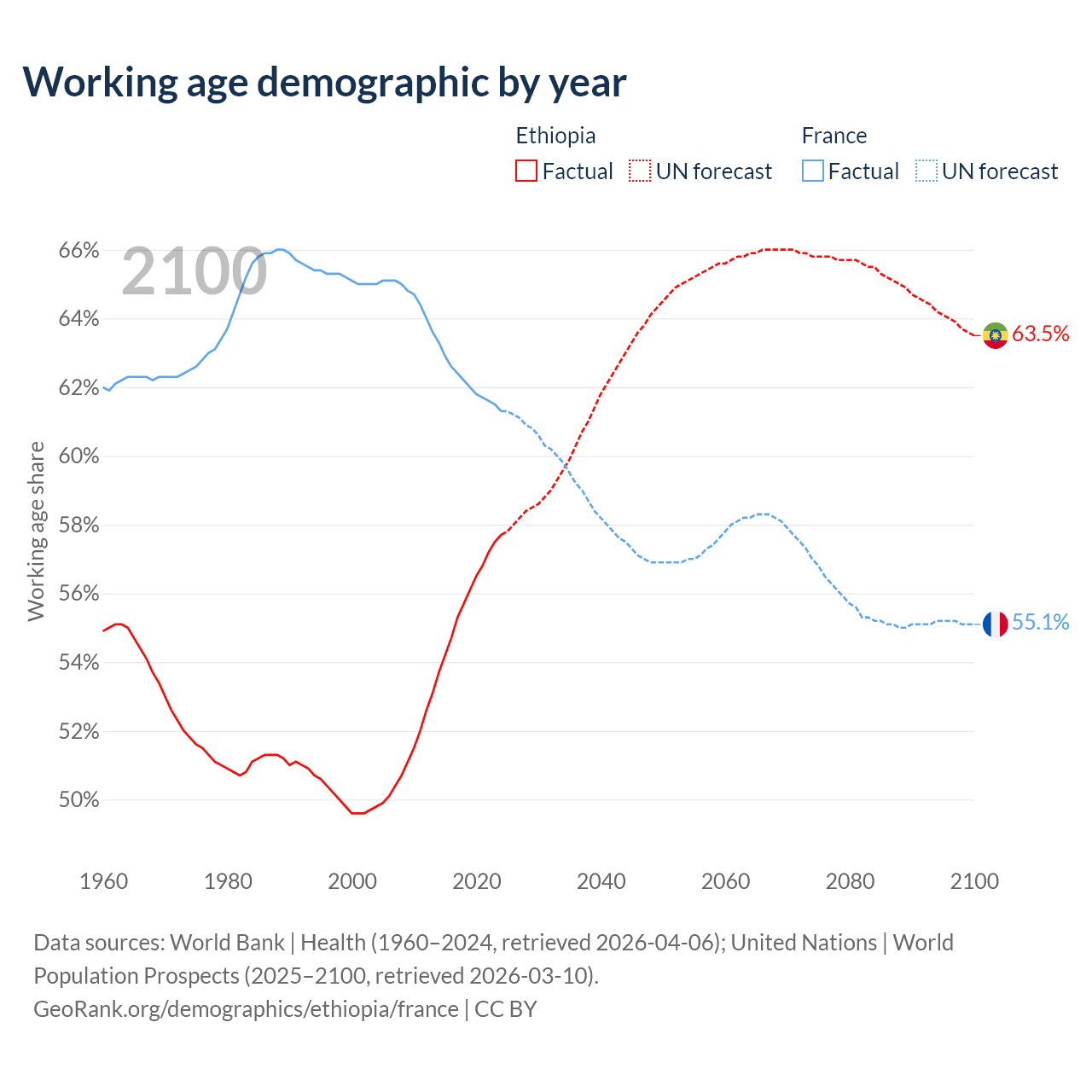 - Ethiopia has 80.7M working age adults (aged 15-64) vs 42.2M in France.
