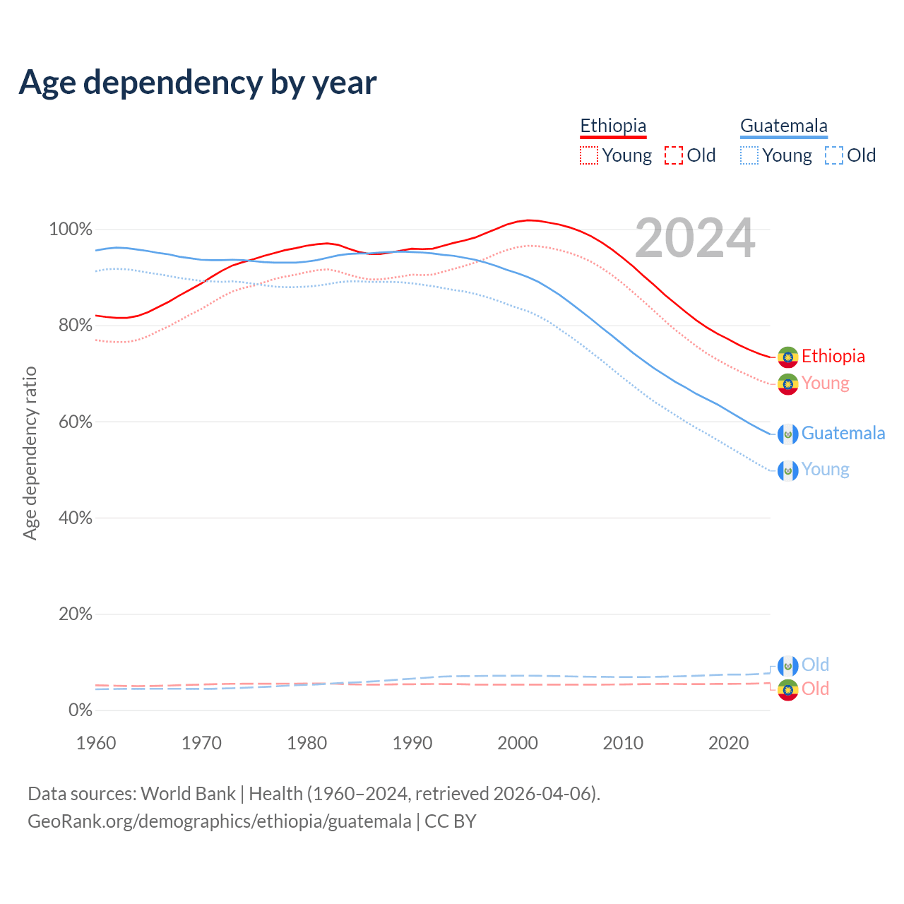 - Ethiopia is ranked 167/196 by median age (oldest to youngest) vs 137/196 for Guatemala.