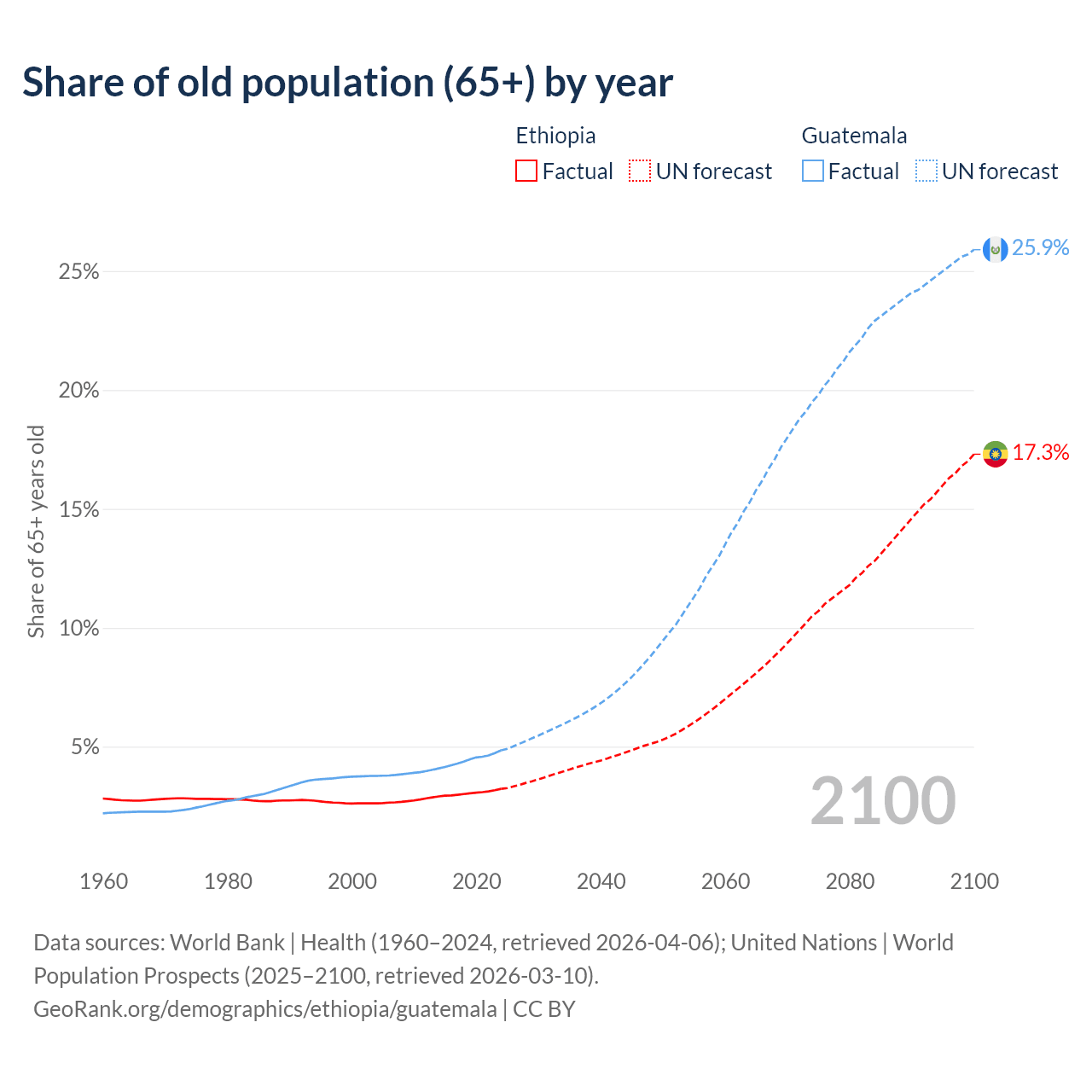 The share of older people aged 65 and over is 3.23% in Ethiopia and 4.85% in Guatemala. Life expectancy in Ethiopia compared to Guatemala .