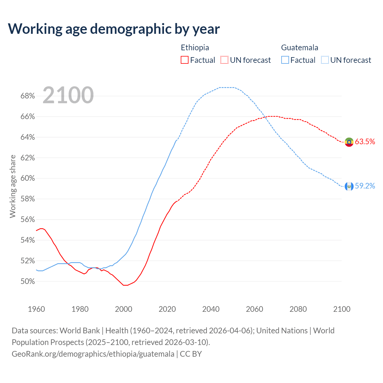 - Ethiopia has 80.7M working age adults (aged 15-64) vs 12.1M in Guatemala.