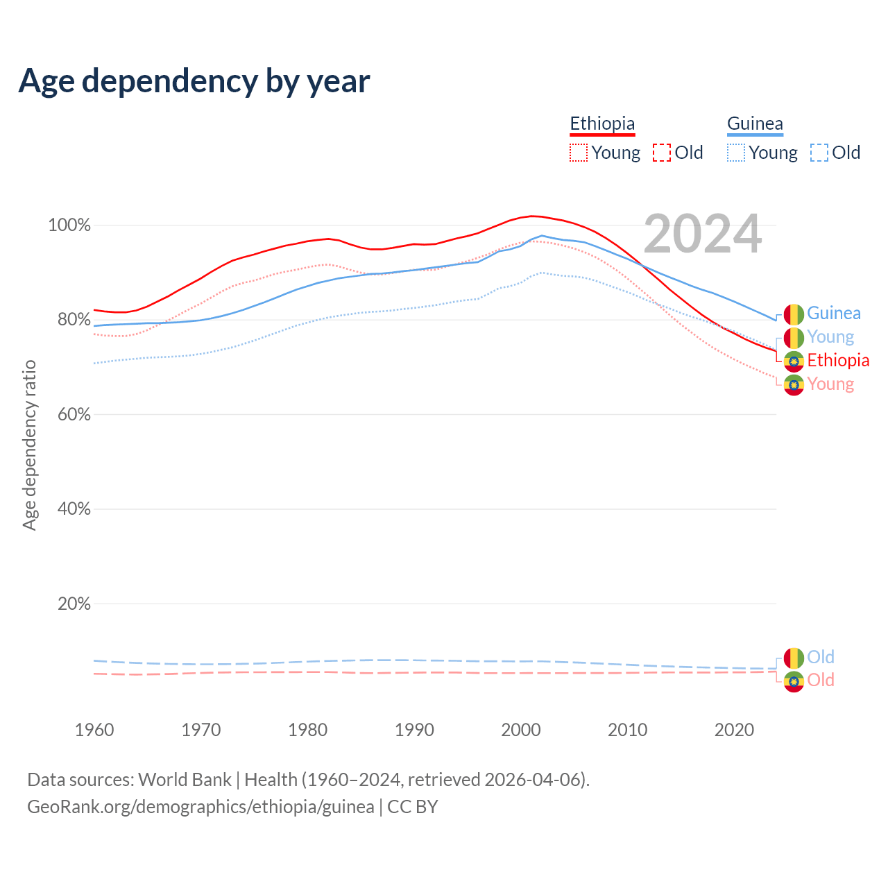 - Ethiopia is ranked 167/196 by median age (oldest to youngest) vs 176/196 for Guinea.