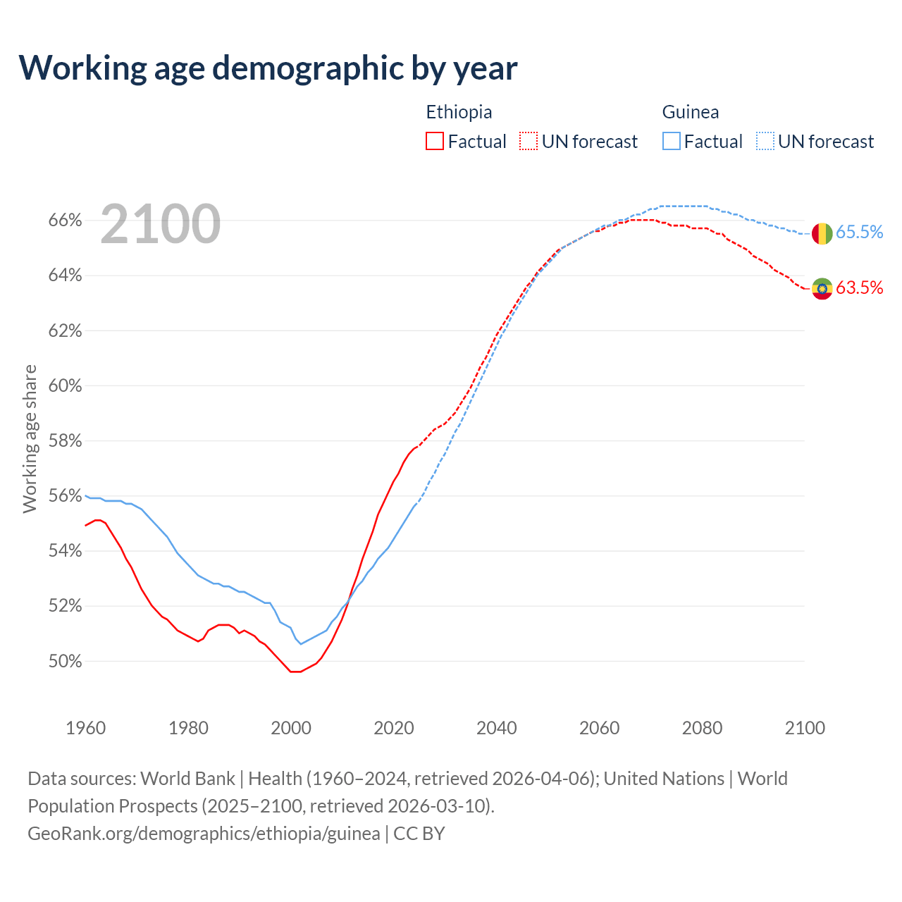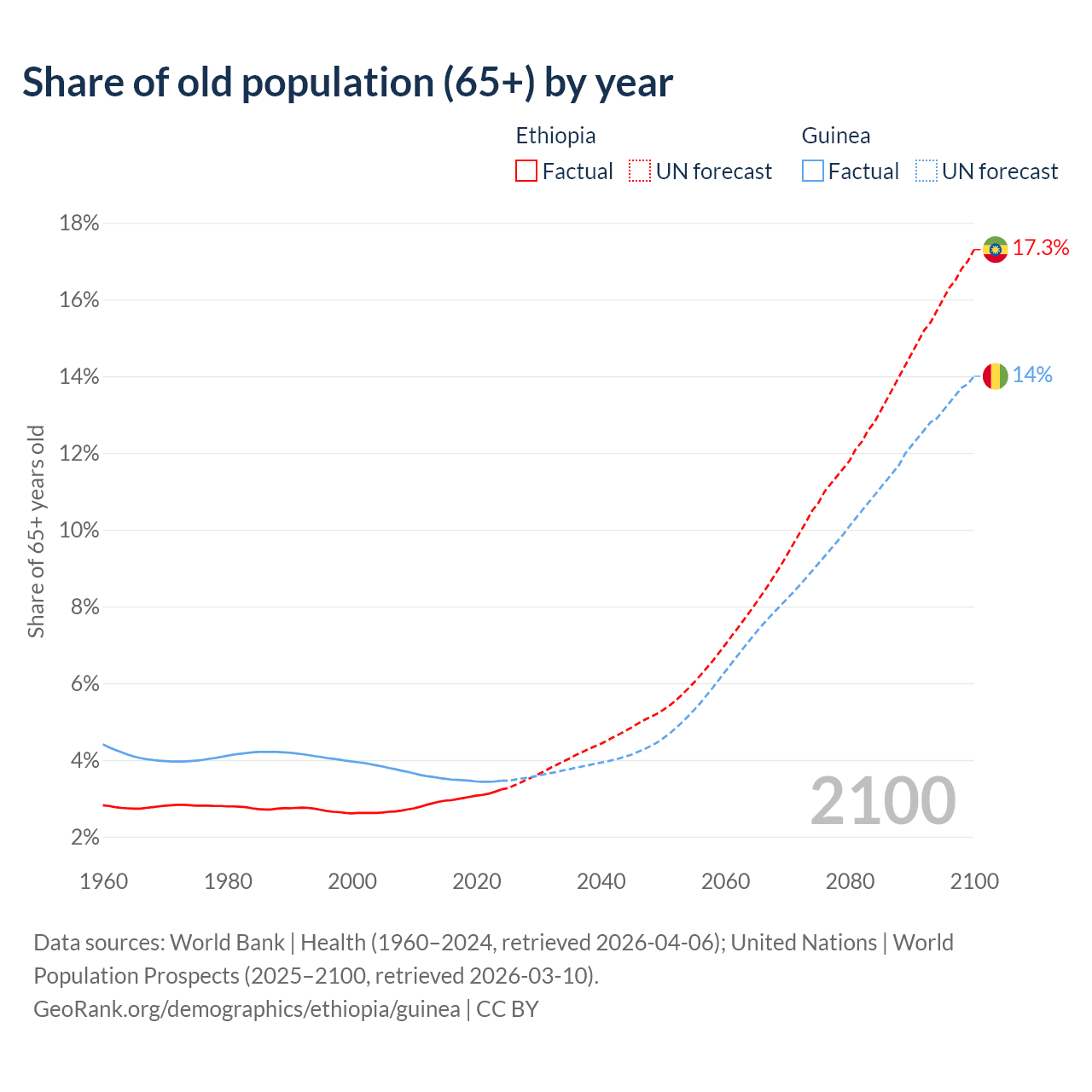 - The share of old-age demographic (65+) in Ethiopia is 3.23% vs 3.46% in Guinea.
