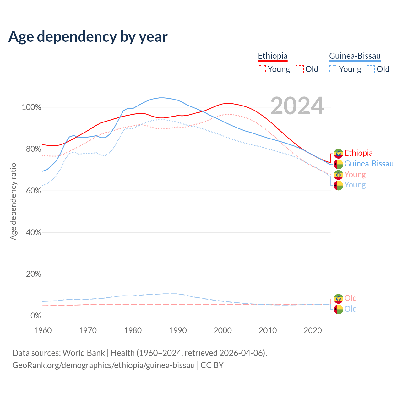 - Ethiopia is ranked 167/196 by median age (oldest to youngest) vs 164/196 for Guinea-Bissau.