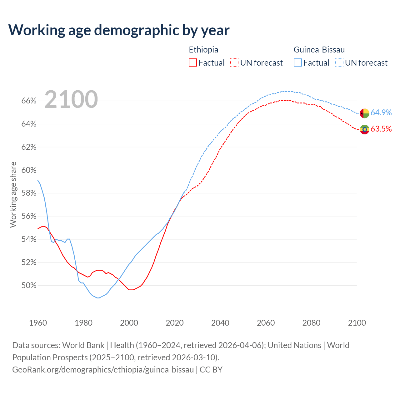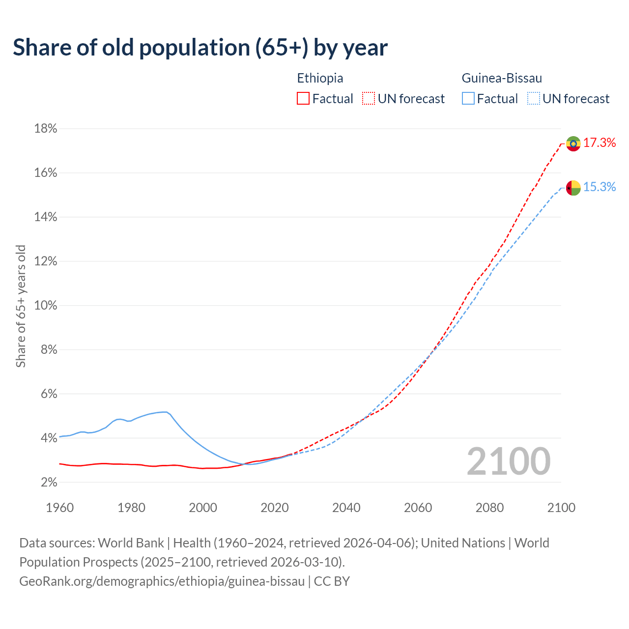- The share of old-age demographic (65+) in Ethiopia is 3.23% vs 3.19% in Guinea-Bissau.
