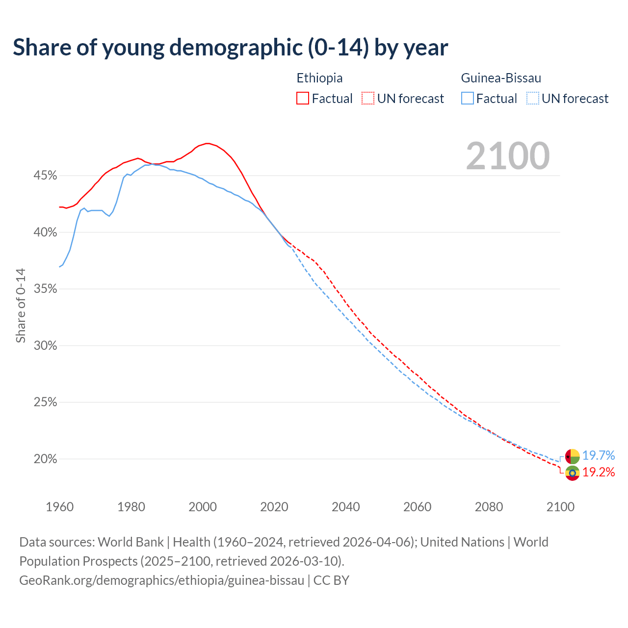 - The share of young demographic (0-15 years old) in Ethiopia is 39.1% vs 38.8% in Guinea-Bissau.