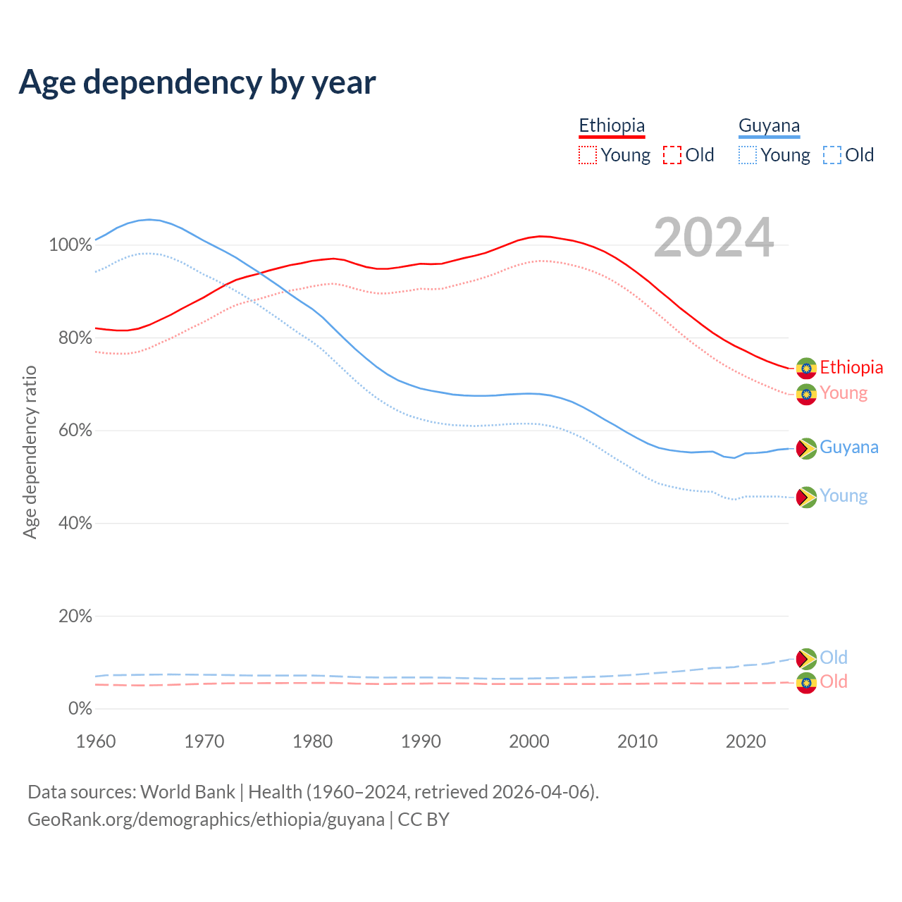- Ethiopia is ranked 167/196 by median age (oldest to youngest) vs 122/196 for Guyana.