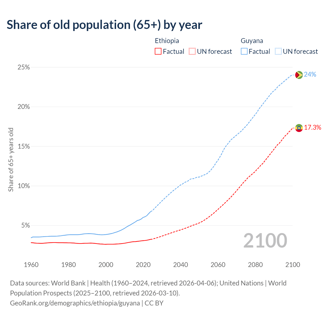 - The share of old-age demographic (65+) in Ethiopia is 3.23% vs 6.73% in Guyana.