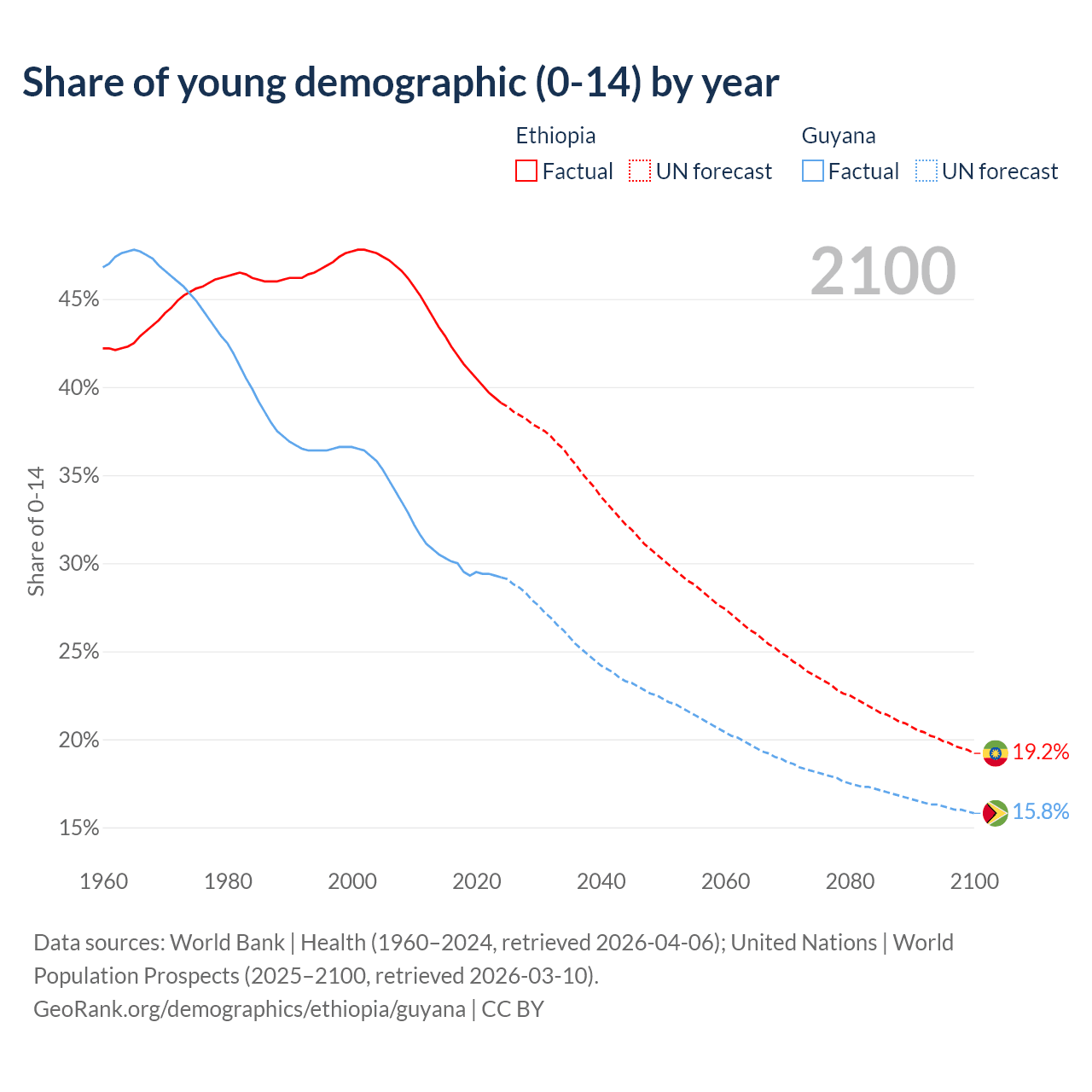 - The share of young demographic (0-15 years old) in Ethiopia is 39.1% vs 29.2% in Guyana.